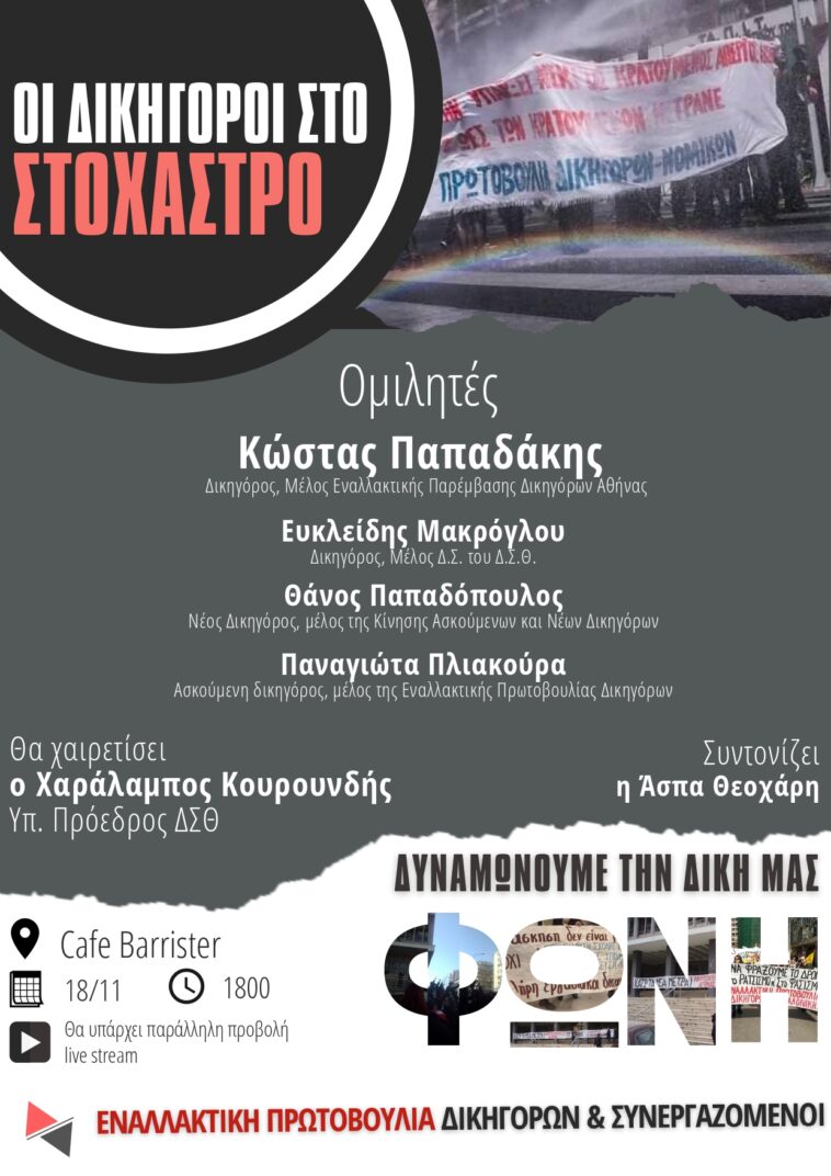 Η ανάγκη να συσπειρωθούν οι ευρύτερες αγωνιστικές δυνάμεις και τα ασθενέστερα στρώματα της δικηγορίας είναι πλέον επιτακτική. Για να διαμορφώσουμε μαζί ένα άλλο πρότυπο συνδικαλισμού, που θα διεκδικήσει κατακτήσεις για τις συνθήκες ζωής και εργασίας μας και θα μας ξαναφέρει σε επαφή με τη χειμαζόμενη κοινωνία» αναφέρεται στο κάλεσμα της εκδήλωσης.