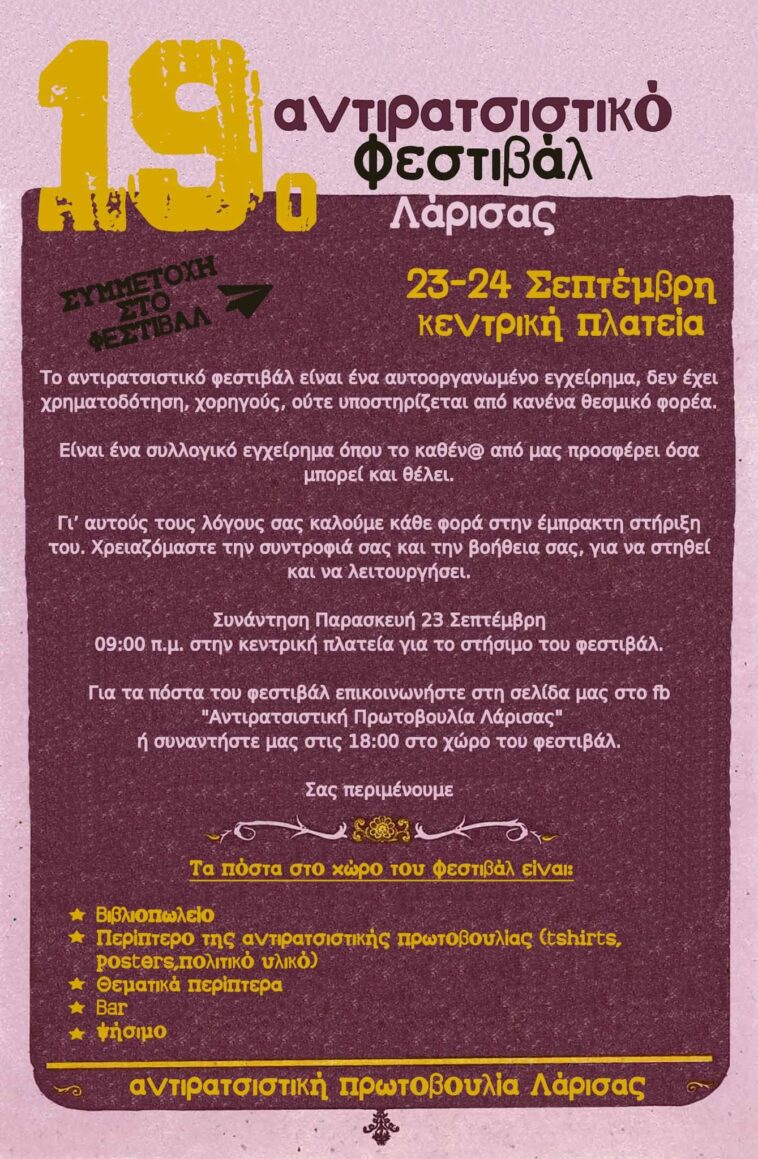 «Για ποια πατρίδα μου μιλάς, δεν έχω χώμα πρόσφυγας είσαι εσύ και εγώ το ίδιο σώμα». Σήμερα, Παρασκευή 23/9 και αύριο Σάββατο 24/9 θα πραγματοποιηθεί το 19ο Αντιρατσιστικό Φεστιβάλ Λάρισας, στην Κεντρική Πλατεία της πόλης, με θεματικά περίπτερα, συζητήσεις και συναυλίες.