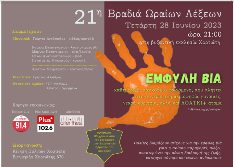 Την Τετάρτη 28 Ιουνίου στις 21:00 στη βυζαντινή εκκλησία του Χορτιάτη θα πραγματοποιηθεί η 21η Βραδιά Ωραίων Λέξεων, μια διοργάνωση της Κίνησης Πολιτών Χορτιάτη και της Εφημερίδας Χορτιάτης 570.