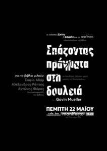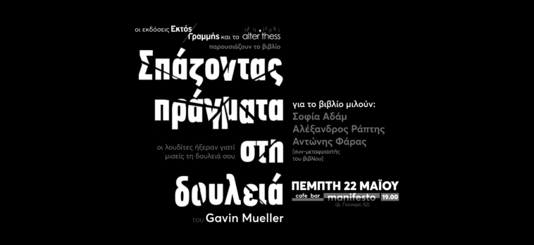 Οι Εκδόσεις Εκτός Γραμμής και το alter-βιβλίο/alterthess μάς προσκαλούν στην παρουσίαση του βιβλίου του Γκάβιν Μιούλερ Σπάζοντας πράγματα στη δουλειά, την Πέμπτη 22 Μαΐου στις 7:00 μ.μ., στο καφέ-μπαρ Manifesto (Δ. Γούναρη 51, Ροτόντα).