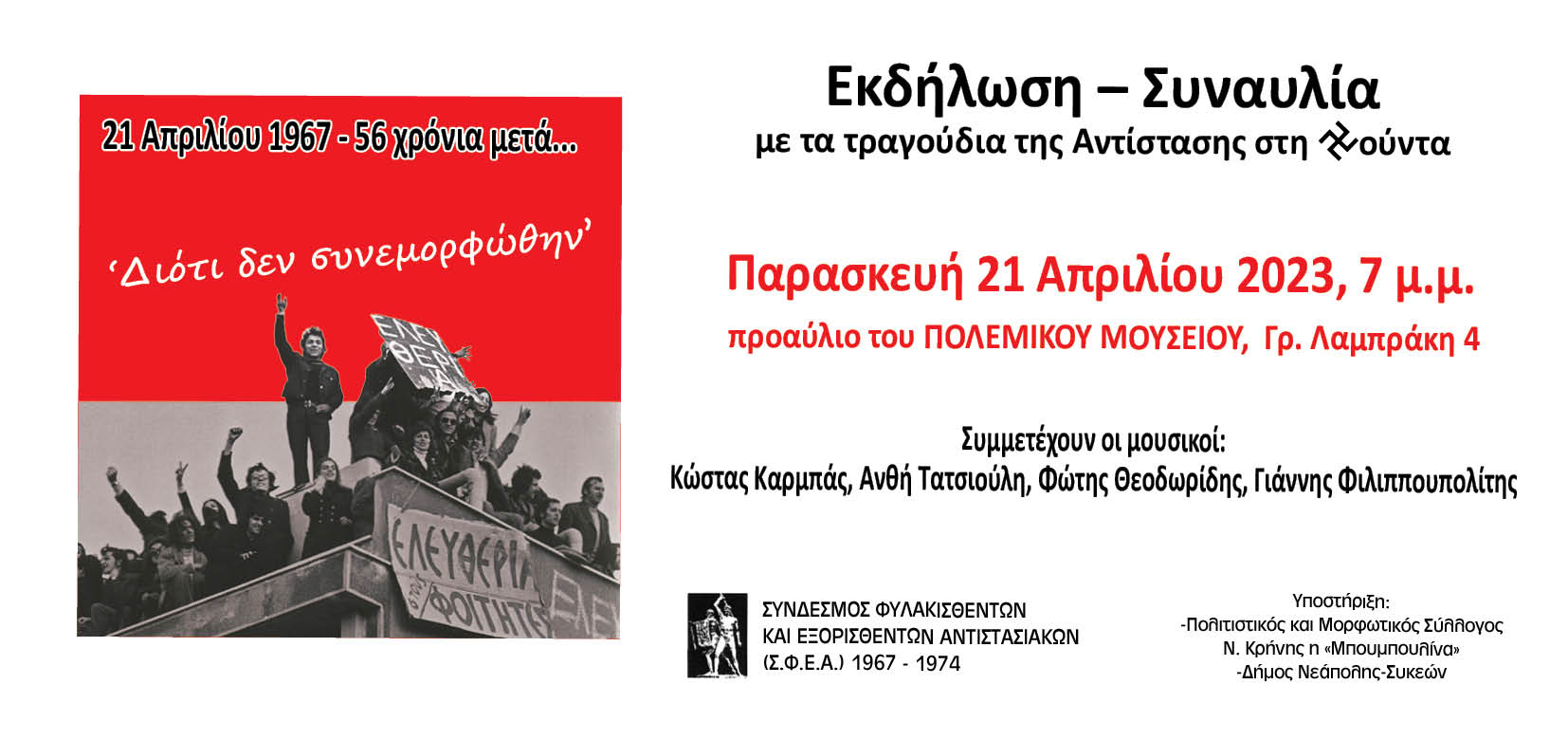 Ο ΣΦΕΑ 1967-1974 την Παρασκευή 21/4, ανήμερα της 56ης επετείου του πραξικοπήματος των συνταγματαρχών στις 21/4/1967, θα πραγματοποιήσει εκδήλωση – συναυλία στις 7μ.μ., στο Πολεμικό Μουσείο Θεσσαλονίκης.