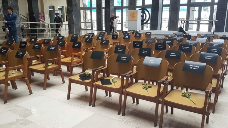 Δικηγόροι τοποθέτησαν 57 τριαντάφυλλα σε ισάριθμες κενές καρέκλες, καθεμία από τις οποίες έγραφε σε μαύρο φόντο το όνομα και την ηλικία των θυμάτων.