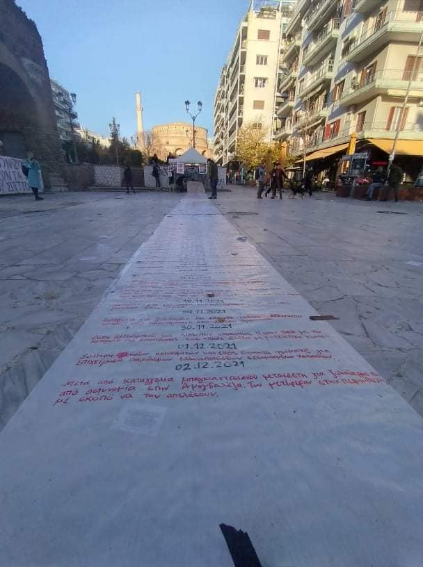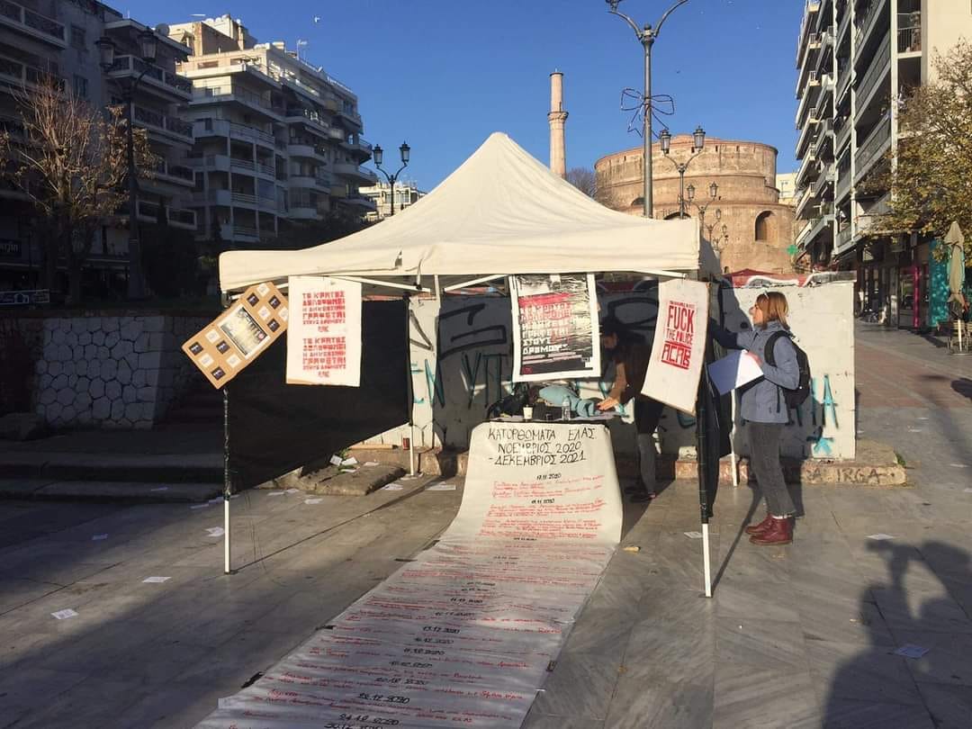 Το αρχείο του «copwatch» (Παρατηρητήριο καταγραφής περιστατικών αστυνομικής βίας) χρησιμοποιήθηκε προχθες, το μεσημέρι του Σαββάτου, στη δράση της αντιεξουσιαστικής Κίνησης Θεσσαλονίκης που περιελάμβανε την κατασκευή μιας τεράστιας λίστας πάνω σε πανό με απαριθμημένα και καταγεγραμμένα αναλυτικά όλα τα κατορθώματα της ΕΛ.ΑΣ. από τις 17 Νοεμβρίου 2020 μέχρι σήμερα: βίαιη καταστολή, απάνθρωπες επαναπροωθήσεις, σεξιστικές επιθέσεις και κάθε λογής μαφιόζικες δραστηριότητες.