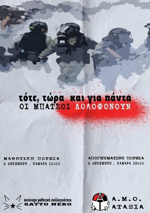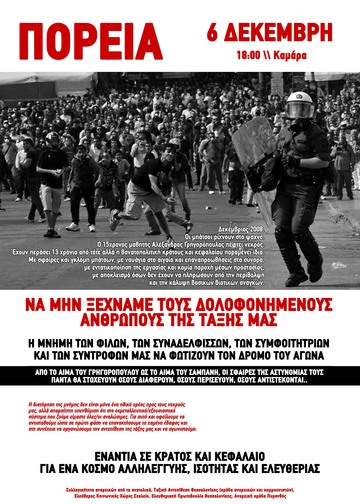 Η 6η Δεκέμβρη δεν είναι ένα κινηματικό “μνημόσυνο”. Η 6η Δεκέμβρη είναι η ζωντανή υπενθύμιση αγώνα που καθιστά σαφές πως τιμή και εκδίκηση για τους νεκρούς μας είναι μονάχα η οργάνωση της προλεταριακής αντεπίθεσης και της ταξικής αυτοάμυνας. Η οργάνωση της αντεπίθεσης της τάξης μας που θα θεμελιώσει τον δρόμο για έναν κόσμο χωρίς εκμετάλλευση και καταπίεση ανθρώπου από άνθρωπο, έναν κόσμο ελευθερίας και ισότητας».
