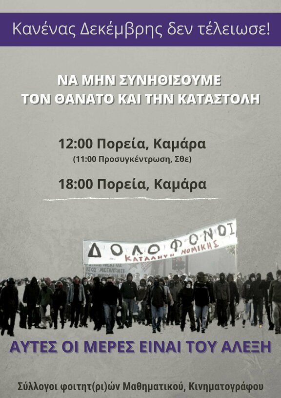 «Η νεολαία, μαθητές/τριες και φοιτητές, οι προλετάριοι, εργαζόμενοι/ες και άνεργοι, τα φτωχά κοινωνικά στρώματα, οι μετανάστριες και οι κάθε λογής αποκλεισμένοι και αδικημένοι, αυτοί που κρατούν σφιχτά τον ρου της ιστορίας στα χέρια τους, ξέρουν πως ο Δεκέμβρης του αναρχικού μαθητή Αλέξη, είναι ο Δεκέμβρης όλων των δολοφονημένων από τους ένστολους υπηρέτες του κράτους, των πνιγμένων μεταναστ(ρι)ών στο Αιγαίο, των νεκρών εργατών στα λιμάνια, των φυλακισμένων που νόσησαν και αφέθηκαν να πεθάνουν χωρίς περίθαλψη. Γνωρίζουν, πως ο Δεκέμβρης του Αλέξη είναι ο Δεκέμβρης του Μιχάλη Καλτεζά, του Ιάκωβου Κουμή, της Σταματίνας Κανελλοπούλου, του Λάμπρου Φούντα, του Ζακ Κωστόπουλου (Zackie oh), του Δημήτρη Δαγκλή, του Νίκου Σαμπάνη …