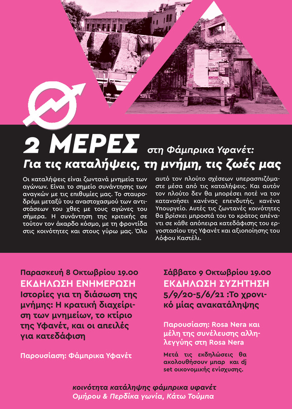 Σήμερα Παρασκευή 8 Οκτωβρίου στις 19.00 θα πραγματοποιηθεί εκδήλωση-ενημέρωση με θέμα «Ιστορίες για τη διάσωση της μνήμης: Η κρατική διαχείριση των μνημείων, το κτίριο της Υφανέτ, και οι απειλές για κατεδάφιση» από την κοινότητα της κατάληψης φάμπρικα υφανέτ που βρίσκεται στην συμβολή των οδών Ομήρου & Περδίκα στην Κάτω Τούμπα. Η εκδήλωση πραγματοποιείται στα πλαίσία δράσεων πολιτικής υπεράσπισης της κατάληψης την ίδια στιγμή που υπηρεσίες προωθούν την εκκένωση και την κατεδάφισή του.