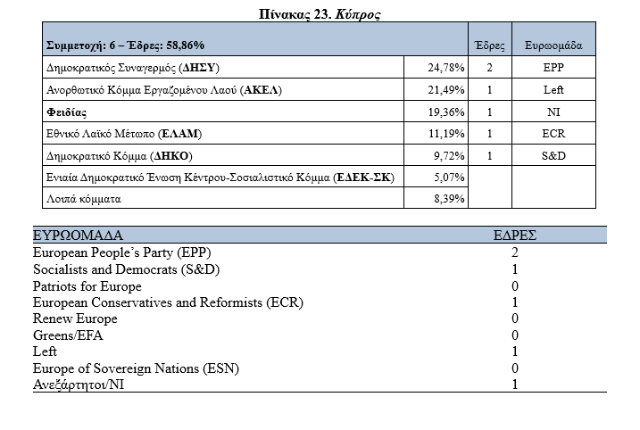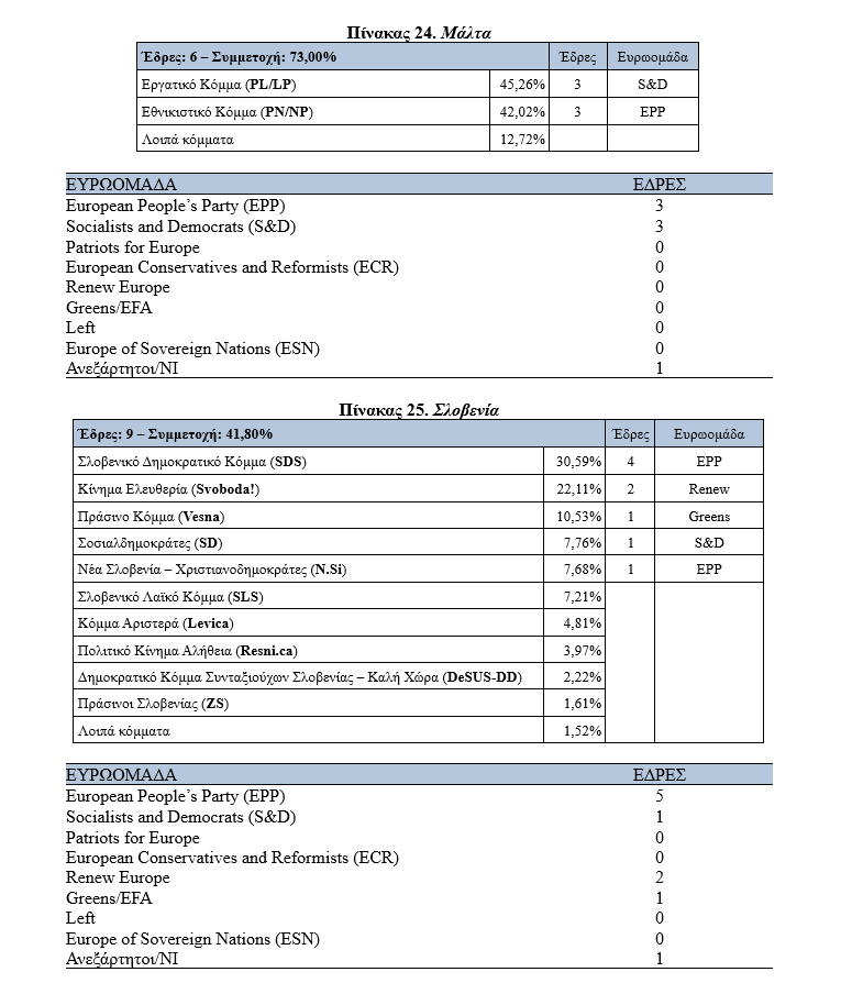 Το Ευρωπαϊκό Λαϊκό Κόμμα κέρδισε σχεδόν τις μισές έδρες των τριών αυτών χωρών, συγκεκριμένα δέκα, και δύο κόμματα που συμμετέχουν σ’ αυτό κατέλαβαν την πρώτη θέση. Πρώτο, λοιπόν, στη Σλοβενία ήταν το Σλοβενικό Δημοκρατικό Κόμμα με 30,59% και τέσσερις έδρες, διπλάσιες από το 2019. Στην ίδια ομάδα ανήκει κι η Νέα Σλοβενία – Χριστιανοδημοκράτες που με 7,68% διατήρησε την έδρα του, όπως και το Σλοβενικό Λαϊκό Κόμμα που με 7,21% δεν έβγαλε έδρα. Πρώτος ήταν κι ο Δημοκρατικός Συναγερμός στην Κύπρο με 24,78% και δυο έδρες. Στη Μάλτα το Εθνικιστικό Κόμμα ήταν δεύτερο, μεν, αλλά με ποσοστό 42,02% πήρε τρεις έδρες, μία περισσότερη από τις προηγούμενες εκλογές.
