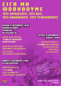 «Η ακροδεξιά, ωστόσο, και οι ναζιστικές και φασιστικές οργανώσεις είναι ακόμα εδώ, όπως και η πατριαρχία σε όλες της εκφάνσεις (σεξισμός, ομοφοβία, τρανσφοβία, χοντροφοβία). Τα περιστατικά της κράτησης μεταναστών στην Αλεξανδρούπολη από ακροδεξιούς ρατσιστές, του πογκρόμ κατά μεταναστών στη Λεμεσό, της δολοφονίας του Αντώνη στον Πειραιά από ρατσιστή/μισανάπηρο ναυτικό, της δολοφονίας της μετανάστριας τρανς περφόρμερ Άννας, αλλά και η είσοδος τριών ακροδεξιών κομμάτων στη Βουλή, με μεγάλα ποσοστά στη Θεσσαλονίκη και τη Βόρεια Ελλάδα (Σπαρτιάτες, Βελόπουλος, Νίκη) μάς βγάζουν στον δρόμο ξανά για να διεκδικήσουμε ελευθερία, αυτοδιάθεση και ίσα δικαιώματα για όλες, όλα και όλους. Ο κοινωνικός κανιβαλισμός καλλιεργείται συστηματικά στην κοινωνία από την ακροδεξιά και τις φασιστικές/ναζιστικές οργανώσεις (αλλά και από τον νεοφιλελευθερισμό με συγκαλυμμένα “πολιτισμένη” μορφή). Δε θα τον αφήσουμε να επικρατήσει».