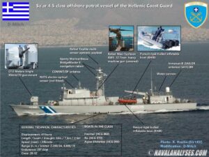 Το μεγαλύτερο σκάφος ήταν γκρι, με μπλε και άσπρες ρίγες στο μπροστινό μέρος. Αφού είδαν φωτογραφίες πλοίων από την Ελληνική Ακτοφυλακή (HCG), αναγνώρισαν το σκάφος ως περιπολικό ανοικτής θαλάσσης κλάσης Sa’ar 4 που ανήκει στην Ελληνική Ακτοφυλακή.