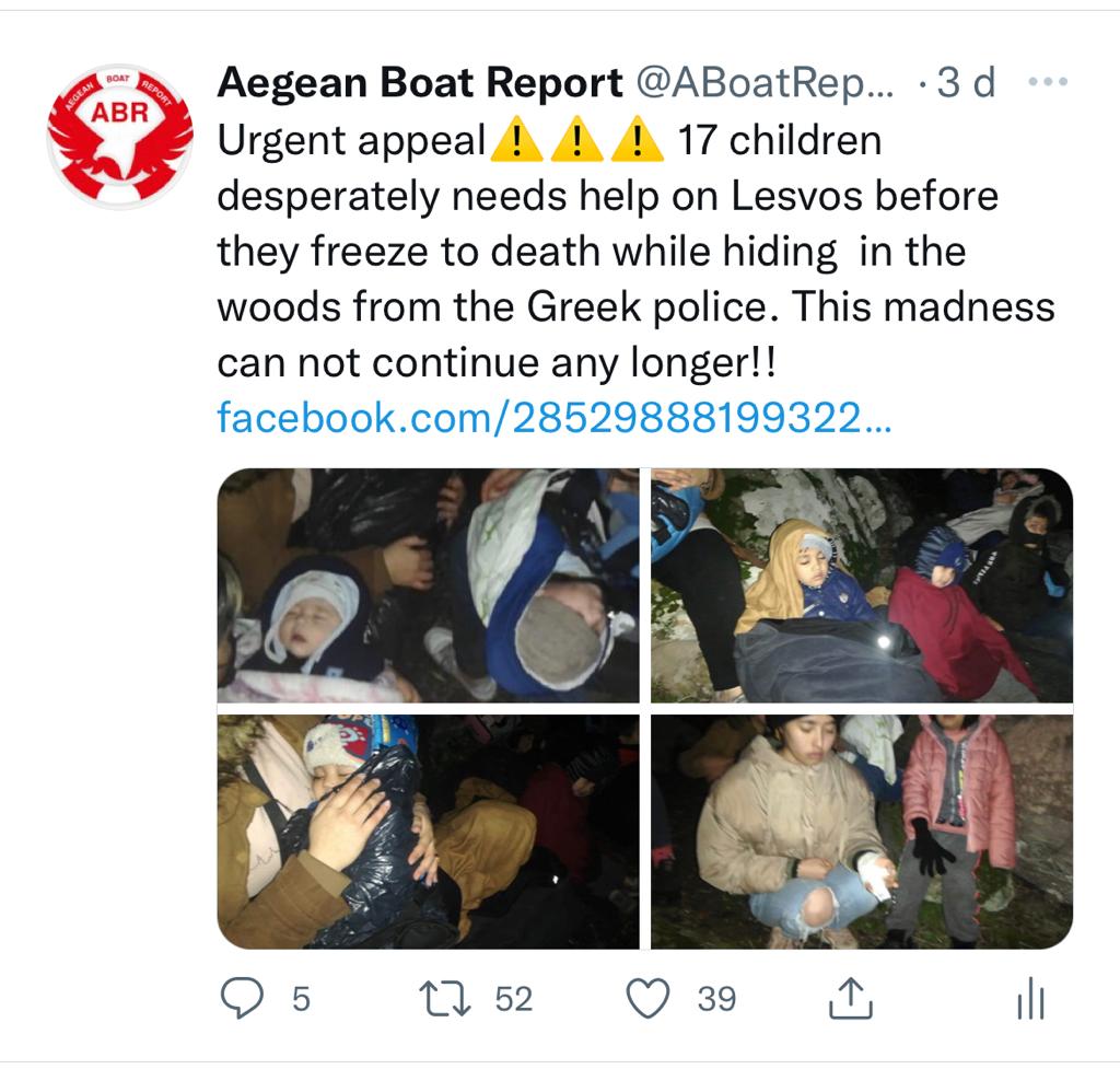 «25 πρόσφυγες έφτασαν χθες στη Λέσβο και ανακοινώθηκε στις αρχές, τον Έλληνα Συνήγορο του Πολίτη και την ελληνική Ύπατη Αρμοστεία σήμερα το πρωί από την Aegean Boat Report. Προτρέψαμε την Ύπατη Αρμοστεία και τον Συνήγορο του Πολίτη να μεσολαβήσουν άμεσα ώστε να εξασφαλίσουν ότι τα δικαιώματά τους θα γίνουν σεβαστά. 17 από τους 25 ανθρώπους είναι παιδιά».