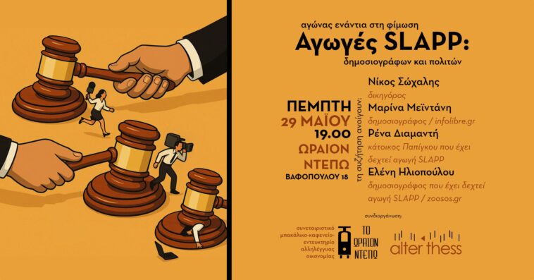 Μια συζήτηση για τις στρατηγικές αγωγές ενάντια στη δημόσια συμμετοχή και για την ανάγκη στήριξης όσων στοχοποιούνται από πολιτικά και επιχειρηματικά συμφέροντα διοργανώνουν από κοινού το Alterthess και Το Ωραίον Ντεπώ, την Πέμπτη 29 Μαΐου στις 19.00 το απόγευμα στο Ωραίον Ντεπώ (Βαφόπουλου 18, Θεσσαλονίκη).