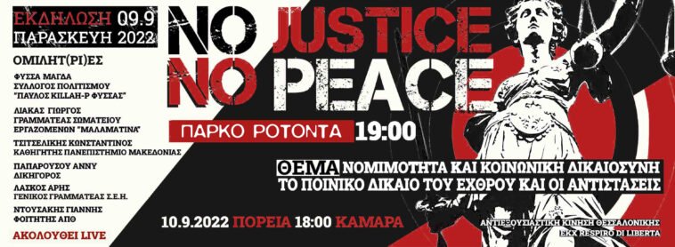 Η εκδήλωση No Justice – No Peace θα πραγματοποιηθεί την Παρασκευή 9/9/2022 στις 19:00 στην
