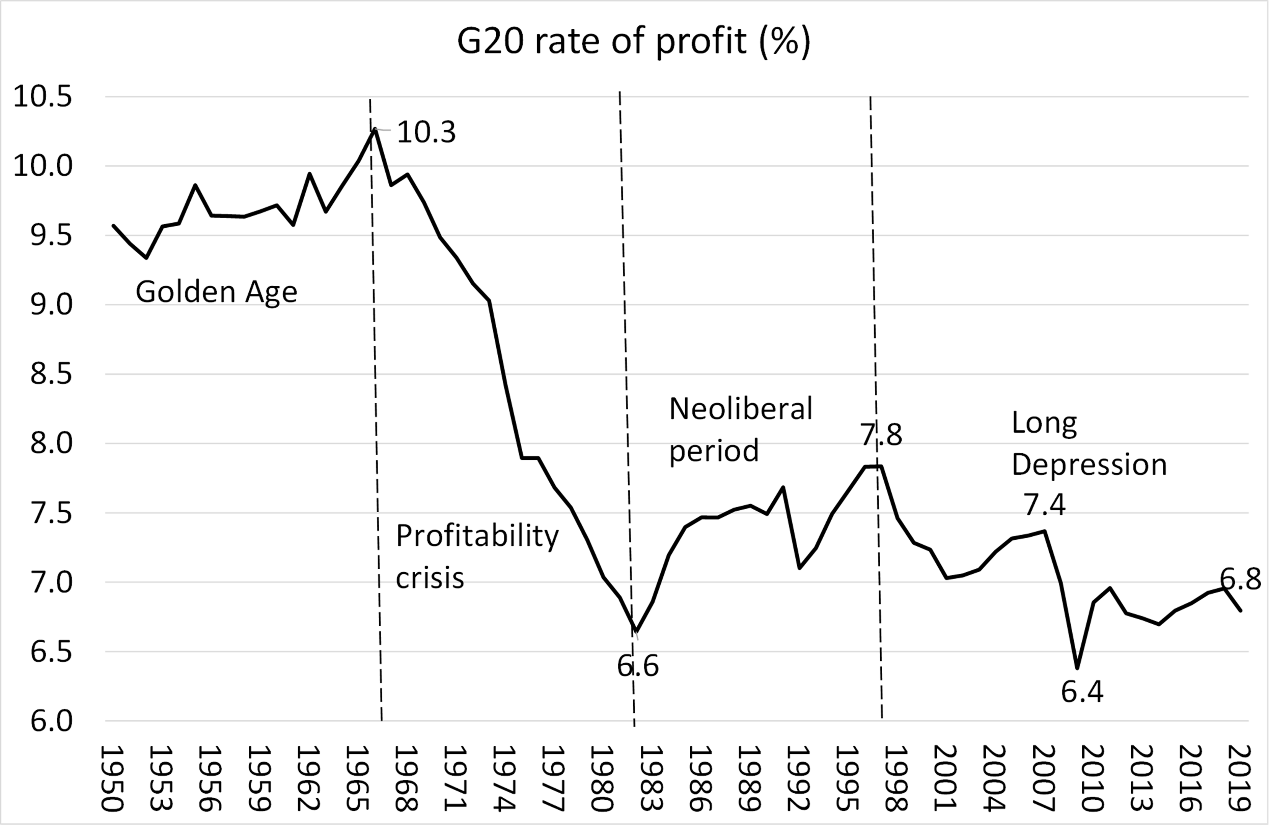 Δεν θα επιχειρηματολογήσω αναλυτικά -θα επανέλθω, σε αυτό, άλλοτε. Νομίζω, όμως, ότι το παρακάτω γράφημα, που παρουσιάζει την πορεία του ποσοστού κέρδους στο G-20, μεταξύ 1950 και 2020 είναι αρκετό, για να δείξει αυτό που θέλω να επισημάνω.