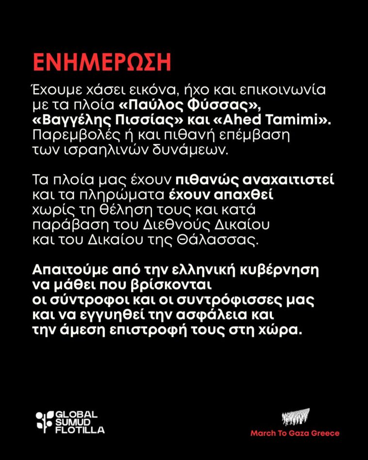 Το March to Gaza, οργανώσεις, συνδικάτα και συλλογικότητες από όλη την Ελλάδα απαιτούν από την ελληνική κυβέρνηση να εγγυηθεί την ασφαλή επιστροφή του πληρώματος και να λάβει κάθε αναγκαία ενέργεια για την προστασία των Ελλήνων και Ελληνίδων που επιβαίνουν σε αυτά.