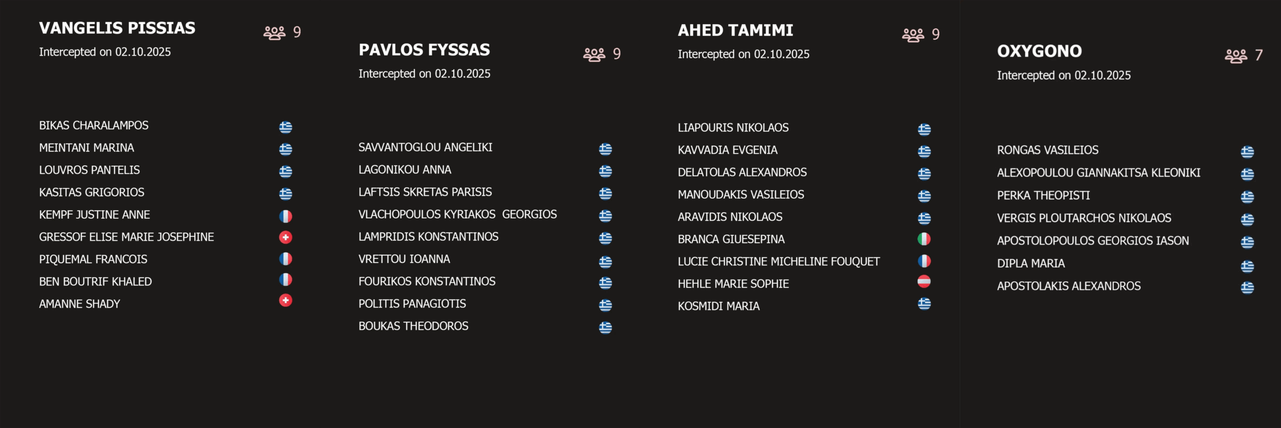 Όπως έχει ανακοινώσει το March to Gaza Greece:«Η επαφή με το πλοίο Ahed Tamimi χάθηκε στις 5:05 ώρα Ελλάδας. Στις 04:56, ώρα Ελλάδας χάθηκε η επαφή με το πλοίο «Βαγγέλης Πισσίας», και στις 4:22 η επαφή με το πλοίο Παύλος Φύσσας. Ο ισραηλινός στρατός κατοχής κατέλαβε το πλοίο Οξυγόνο της ελληνικής αποστολής στις 6.23 ώρα Ελλάδας περίπου 40 ναυτικά μίλια από τις ακτές της Γάζας». Σύμφωνα με την ενημέρωση τα πλοία έχουν κατασχεθεί και το πλήρωμα τους (26 άτομα) έχει απαχθεί από τον ισραηλινό στρατό, παρά την θέληση του και κατά παράβαση του Διεθνούς Δικαίου και του Δικαίου της Θάλασσας .