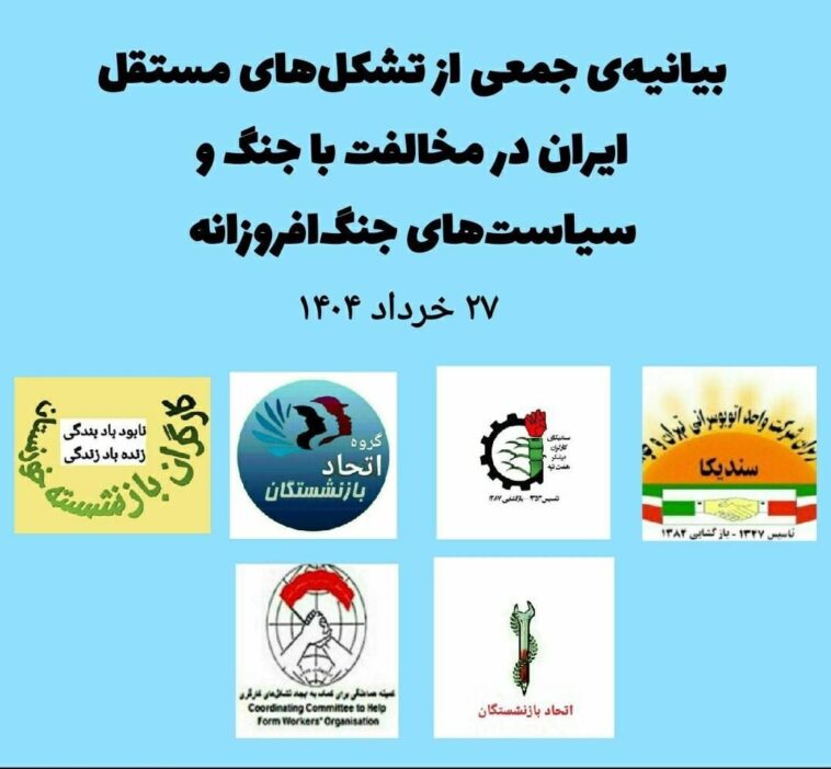 Εμείς, οι ανεξάρτητες εργατικές και λαϊκές συλλογικότητες και ακτιβιστές του Ιράν, δεν έχουμε αυταπάτες ότι οι ΗΠΑ και το Ισραήλ έρχονται να μας φέρουν την ελευθερία, την ισότητα και τη δικαιοσύνη — όπως δεν έχουμε αυταπάτες και για την καταπιεστική, παρεμβατική, τυχοδιωκτική και αντεργατική φύση και τις ανάλογες ενέργειες της Ισλαμικής Δημοκρατίας.