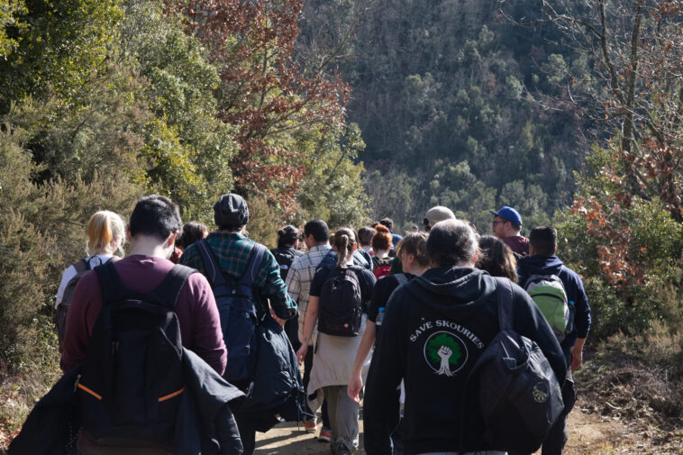 Πεζοπορία στις Σκουριές, στο όρος Κάκαβος, πραγματοποίησαν σήμερα πολίτες της ΒΑ Χαλκιδικής και της Θεσσαλονίκης μετά από κάλεσμα της επιτροπής αγώνα Μ. Παναγιάς και με τη στήριξη των συνελεύσεων του Δήμου Αριστοτέλη. Ήταν μια πεζοπορία διαμαρτυρίας ενάντια στις εξορύξεις χρυσού-χαλκού και την καταστροφή ενός πανέμορφου δάσους από την εταιρεία Ελληνικός Χρυσός στην οποία συμμετείχαν περίπου 200 άτομα. Το έναυσμα δόθηκε από συνελεύσεις κατοίκων που έγιναν το τελευταίο διάστημα στον Δήμο Αριστοτέλη μετά και τις τελευταίες εξελίξεις με την ανακοίνωση της χρηματοδότησης της εταιρείας από τις ελληνικές τράπεζες και το Ταμείο Ανάκαμψης με το συνολικό ποσό των 680 εκατομμυρίων ευρώ καθώς και την επανέναρξη των κατασκευών στις Σκουριές.