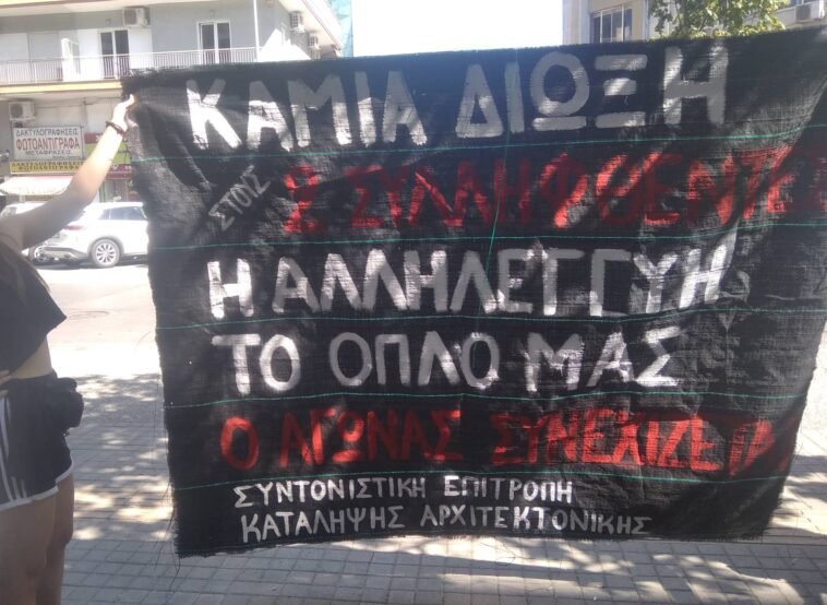 Χθες Παρασκευή οι δύο συλληφθέντες οδηγήθηκαν στο Αυτόφωρο Τριμελές Πλημμελειοδικείο Θεσσαλονίκης όπου πήραν αναβολή για σήμερα στις 12 μ.μ. να δικαστούν ενώ συγκέντρωση αλληλεγγύης πραγματοποίησαν συμφοιτητές/τριες τους που τους υποδέχτηκαν με συνθήματα και χειροκροτήματα μόλις αφέθηκαν ελεύθεροι.
