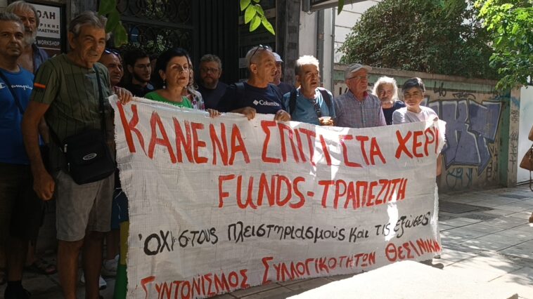 Ο Συντονισμός Συλλογικοτήτων Θεσσαλονίκης κατήγγειλε ότι οι κόποι μιας ζωής αποτελούν για τις τράπεζες απλά ένα ακόμη «χρηματοπιστωτικό προϊόν». «Σήμερα η Εθνική έχει πουλήσει (κοψοχρονιά)το δάνειο σε γνωστό ιρλανδικό Fund, το οποίο εκπροσωπείται στην Ελλάδα από την “doValue”και βγαίνει σε πλειστηριασμό για“χρέος” που τα Funds, με τα ατελείωτα πανωτόκια, το ανεβάζουν στα 88.000 ευρώ!!!» σημείωνε ακόμη σε σχετική ανακοίνωσή του ο Συντονισμός δηλώνοντας ότι μόνο με την αλληλεγγύη και τη συλλογική αντίσταση μπορούμε τα σπίτια μας να σώσουμε, μόνο με ισχυρό λαϊκό κίνημα και συνολικό ανυποχώρητο αγώνα μπορούμε να διεκδικήσουμε την ανατροπή της βαρβαρότητας.