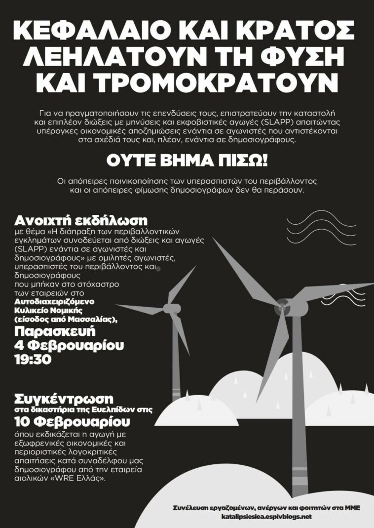 Καλεί ακόμη σε συγκέντρωση στα δικαστήρια της Ευελπίδων στις 10 Φεβρουαρίου όπου εκδικάζεται η αγωγή με εξωφρενικές οικονομικές και περιοριστικές λογοκριτικές απαιτήσεις κατά συναδέλφου μας δημοσιογράφου από την εταιρεία αιολικών «WRE Ελλάς» .
