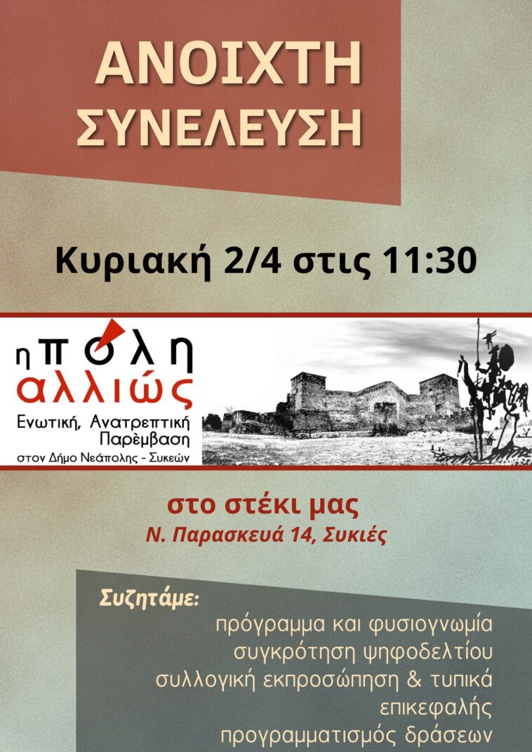 Η δημοτική κίνηση «Πόλη Αλλιώς» (Ενωτική Ανατρεπτική Παρέμβαση στο Δήμο Νεάπολης – Συκεών) καλεί τους πολίτες την Κυριακή 2 Απριλίου στις 11:30 π.μ. στο στέκι της (Ν. Παρασκευά 14, Συκιές) σε ανοιχτή συνέλευση.