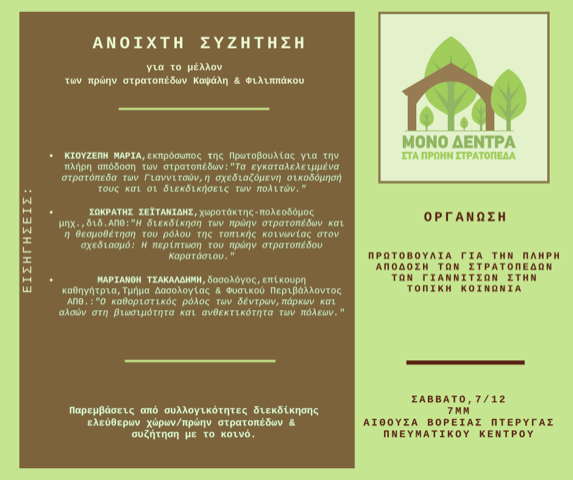 Ανοιχτή συζήτηση διοργανώνει το Σάββατο 7 Δεκεμβρίου στις 19:00 η Πρωτοβουλία για την πλήρη απόδοση των στρατοπέδων των Γιαννιτσών στην τοπική κοινωνία, στην αίθουσα Βόρειας Πτέρυγας του Πνευματικού Κέντρου.