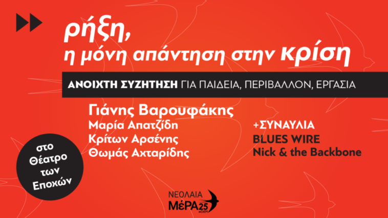 Η Νεολαία του ΜέΡΑ25 διοργανώνει ανοιχτή συζήτηση την Τετάρτη 15/9 στις 20:00 στο Θέατρο των Εποχών στην Παραλία Θεσσαλονίκης (Μ. Αλεξάνδρου 29) με θέμα: «Ρήξη, η μόνη απάντηση στην Κρίση».