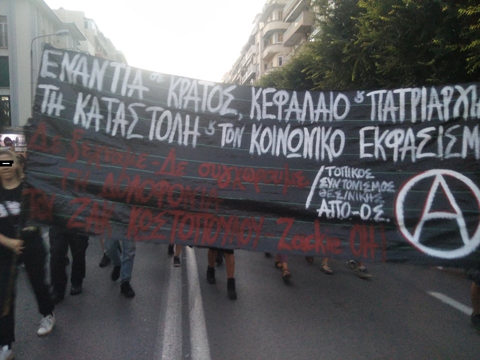 Αντιπατριαρχική πορεία από συλλογικότητες του ΛΟΑΤΚΙ, φεμινιστικού κινήματος και από πολιτικές οργανώσεις πραγματοποιήθηκε το απόγευμα της Τρίτης στο κέντρο της Θεσσαλονίκης, τρία χρόνια μετά τη δολοφονία του Ζάκ Κωστόπουλου/ Zackie Oh.