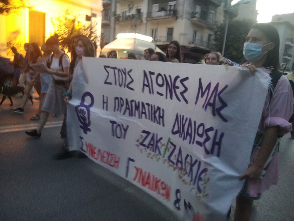 Κατά τη διάρκεια της ιδιαίτερα μαζικής πορείας που είχε παλμό ακούστηκαν μεταξύ άλλων τα συνθήματα: «Το μέλλον μας δεν είναι ο σεξισμός και η βία, παλεύουμε μαζί για μια άλλη κοινωνία», «Οργή και θλίψη, η Ζάκι θα μας λείψει», «Τέρμα η βία, τέρμα ο σεξισμός, ούτε μια λιγότερη από εδώ και μπρος», «Στην Ομόνοια δεν έγινε ληστεία μπάτσοι και αφεντικά κάνανε δολοφονία», «Η Ζάκι ζει, τσακίστε τους ναζί» κ.α.».
