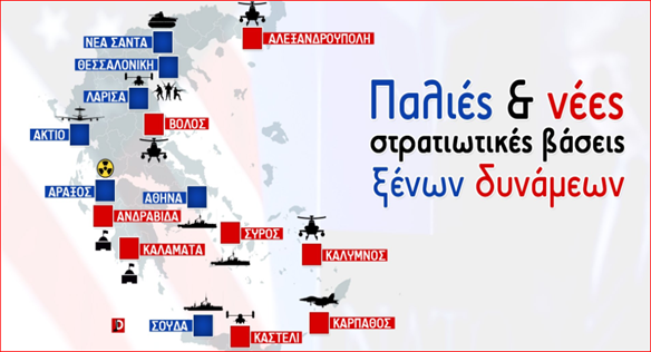 Οι αμερικανικές στρατιωτικές βάσεις αναβαθμίζονται και επεκτείνονται. Δίπλα σ’ αυτές της νότιας, δυτικής και κεντρικής Ελλάδας, έρχονται να προστεθούν νέες σε ανατολική Μακεδονία και Θράκη. Η Σούδα, ο Άραξος, το Άκτιο, η Λάρισα, το Στεφανοβίκειο, η Καβάλα, η Αλεξανδρούπολη, για να μείνουμε στις πιο γνωστές, αποτελούν περιοχές που λειτουργούν ως προγεφυρώματα για τα συμφέροντα των ΗΠΑ. Μέχρι και η Σκύρος τους προσφέρθηκε. Οι ευρείας κλίμακας στρατιωτικές ασκήσεις που πραγματοποιούνται συνεχώς, δείχνουν την πολεμική προετοιμασία και ετοιμότητα ενός κατ’ εξοχήν επιθετικού συνασπισμού, του ΝΑΤΟ. Μια σειρά χώρες της περιοχής ήδη υφίστανται τις “αμυντικές” κινήσεις του (Συρία, Ιράκ, Λιβύη, παλαιότερα Γιουγκοσλαβία κ.ά.). Ενώ ήδη μια ελληνική πυροβολαρχία Πάτριοτ στέλνεται στη Σαουδική Αραβία!