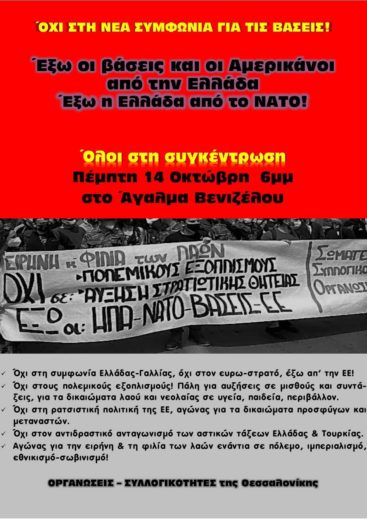 Κάλεσμα για την συγκέντρωση εξέδωσε και η Ε’ ΕΛΜΕ η οποία σημειώνει πως η νέα συμφωνία για τις βάσεις που ετοιμάζεται να υπογράψει η κυβέρνηση με τις ΗΠΑ στις 14 Οκτώβρη και η συμφωνία με την Γαλλία, που ψήφισε η Βουλή στις 7 Οκτώβρη, σηματοδοτούν ένα νέο γύρο παρεμβάσεων των Αμερικάνων και Ευρωπαίων μπεριαλιστών. Μετατρέπουν τη χώρα σε ορμητήριο πολέμου για τους λαούς της περιοχής και ετοιμάζουν νέα δεινά για τη νεολαία και το λαό.