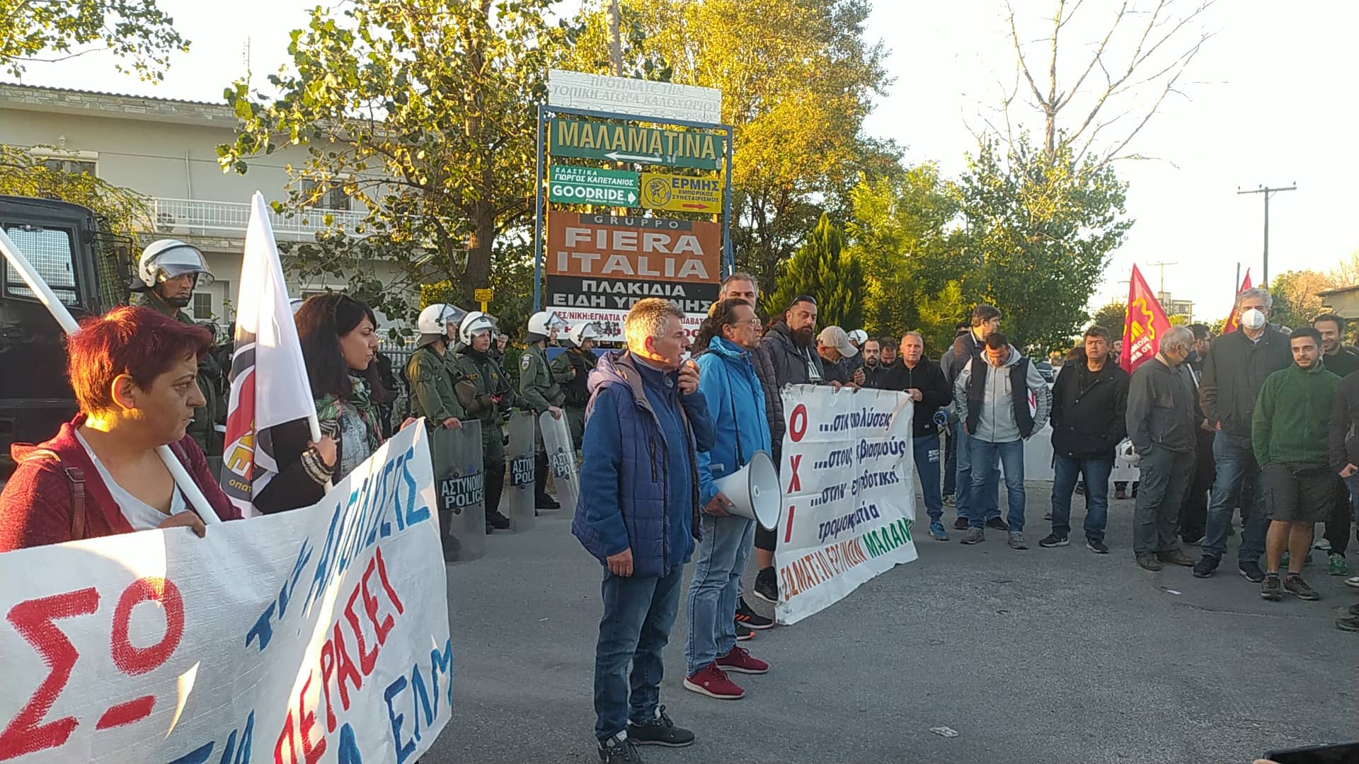 Ένταση προκλήθηκε νωρίτερα έξω από το εργοστάσιο της Μαλαματίνα όταν δύο φορτηγά επιχείρησαν να βγουν από το εργοστάσιο, με τους απεργούν να προσπαθούν να κλείσουν την έξοδο και με τα ΜΑΤ να απαντούν με χρήση δακρυγόνων και χρήση βίας κατά των απεργών. Οι απεργοί κατήγγειλαν την αντίδραση των δυνάμεων να ψεκάσουν με χημικά στα πρόσωπα τους.