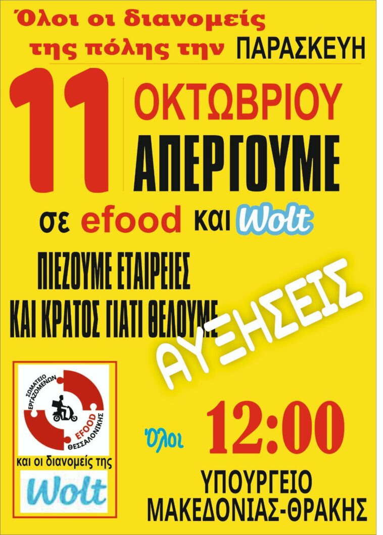 Σε 24ωρη πανελλαδική απεργία προχωρούν αύριο Παρασκευή οι διανομείς της Θεσσαλονίκης σε efood και Wolt. Παρόλη την αδιάλλακτη στάση των εταιρειών, οι διανομείς συνεχίζουν τον αγώνα τους για υπογραφή σύμβασης εργασίας με αύξηση στον βασικό μισθό για τους μισθωτούς και θέσπιση ελάχιστης εγγυημένης αμοιβής ανά ώρα για τους freelancers. Παράλληλα θα γίνει μοτοπορεία στις 12:00 που θα ξεκινήσει από το υπουργείο Μακεδονίας – Θράκης.