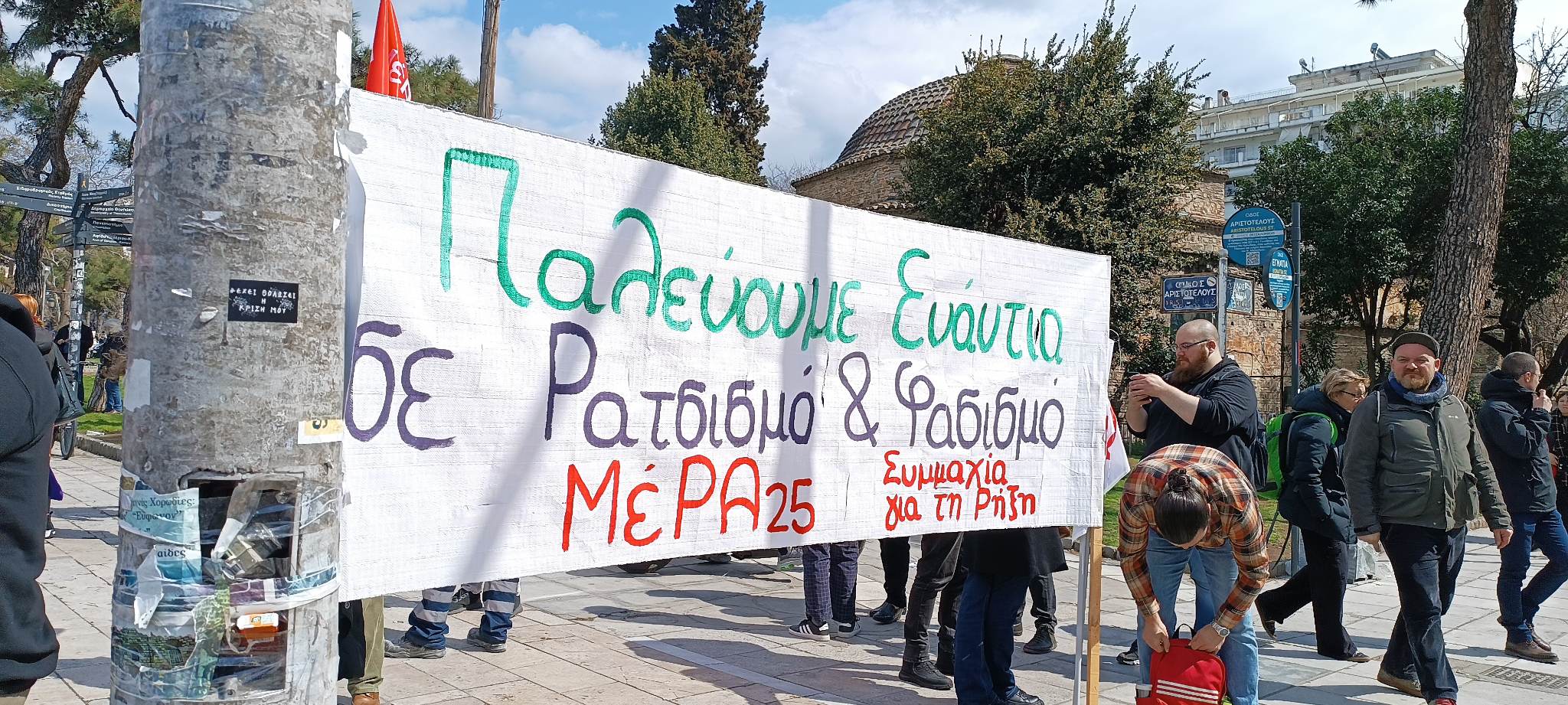 Με πανό και πλακάτ αντιρατσιστικές οργανώσεις και συλλογικότητες της πόλης τίμησαν τη διεθνή μέρα κατά του ρατσισμού και του φασισμού με μια συγκέντρωση στο άγαλμα Βενιζέλου. Όπως αναφέρει η Αντιρατσιστική Πρωτοβουλία Θεσσαλονίκη, «η ελληνική κυβέρνηση – που συμπληρώνει την τετραετία της – κρατά ως σταθερά τις αντιπροσφυγικές κι αντιμεταναστευτικές πολιτικές: φράχτες, pushbacks, απαγωγές κι επαναπροωθήσεις, κλειστά κέντρα «φιλοξενίας» κι ακόμα πιο κλειστά κράτησης, ξήλωμα προγραμμάτων στήριξης κι ένταξης προσφύγων και μεταναστ(ρι)ών, διακοπή χρηματοδοτήσεων κι εξώσεις προσφυγικών οικογενειών από τα σπίτια τους, σκλήρυνση του κώδικα ελληνικής ιθαγένειας, αποκλεισμός από θεμελιώδη δικαιώματα».