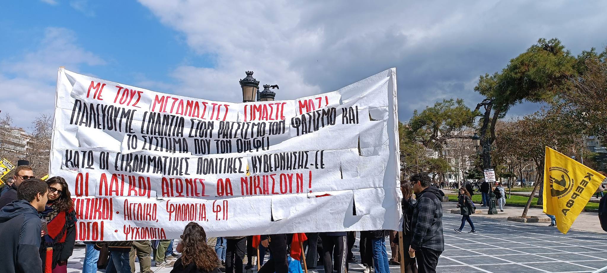 «Στα Τέμπη δολοφόνησαν εργάτες, φοιτητές, μετανάστες, στα σύνορα πνίγουν μετανάστες» τονίζουν ενώ παράλληλα εξέφρασαν τα συλλυπητήρια τους στις οικογένειες των 57 νεκρών στα Τέμπη, ανάμεσα τους 11 εργάτες του ΟΣΕ, πολλοί φοιτητές και φοιτήτριες καθώς και άλλοι εργάτες, ντόπιοι και μετανάστες. Τουλάχιστον δύο εργάτες είναι από το Μπαγκλαντές που γνωρίζουν φίλοι τους ότι ήταν στο τρένο και σκοτώθηκαν». «Άραγε, κάποιοι που δεν είχαν φίλους, δεν έχουν συγγενείς στην χώρα θα ταυτοποιηθούν ποτέ;» διερωτήθηκαν.