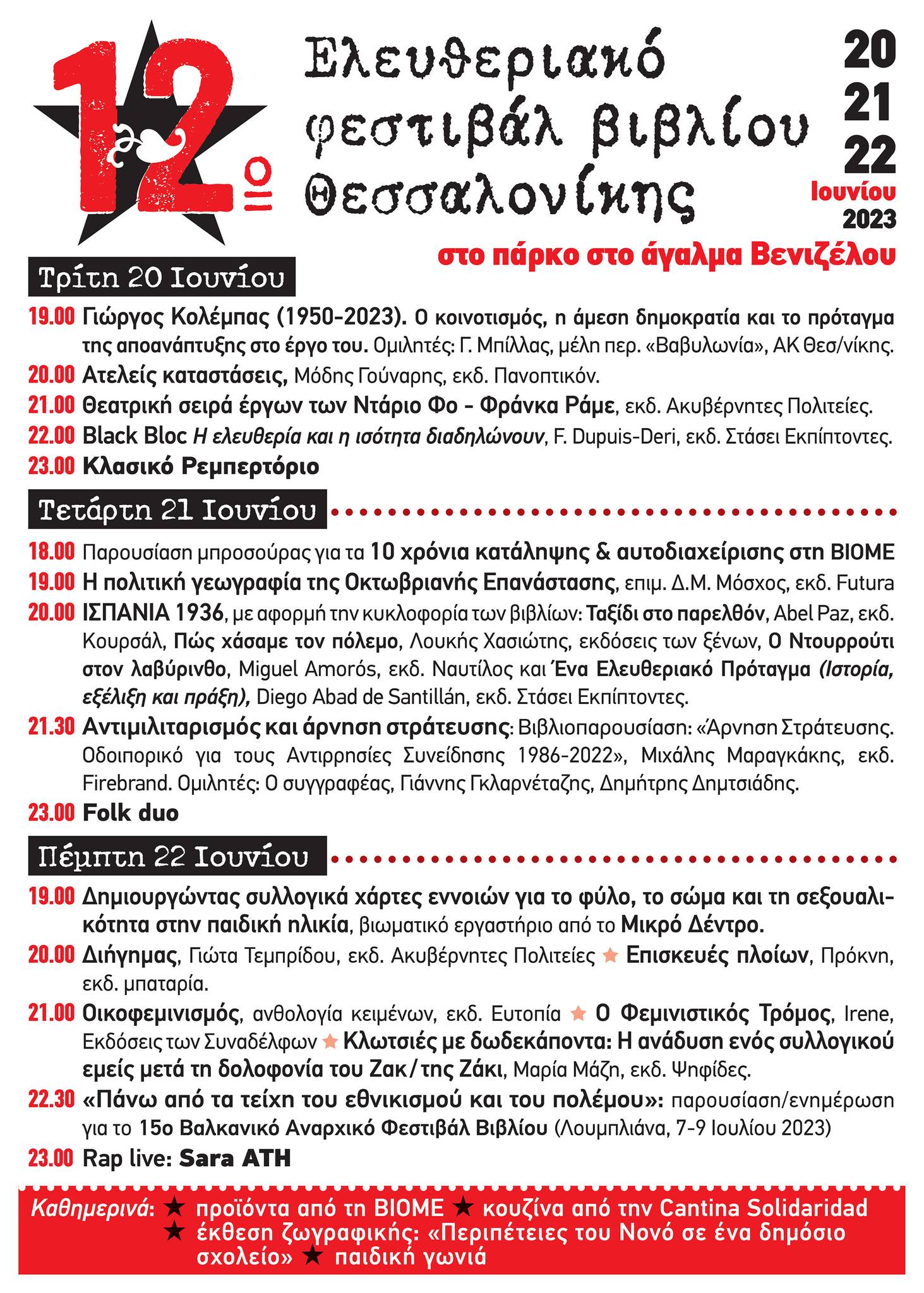 Με πλήθος εκδηλώσεων, συζητήσεων και μουσικών δρώμενων ξεκινάει την Τρίτη 20 Ιουνίου το 12ο Ελευθεριακό Φεστιβάλ Βιβλίου Θεσσαλονίκης και θα διαρκέσει έως την Πέμπτη 22 Ιουνίου. Το φεστιβάλ θα πραγματοποιηθεί στο πάρκο πάνω από το άγαλμα Βενιζέλου.