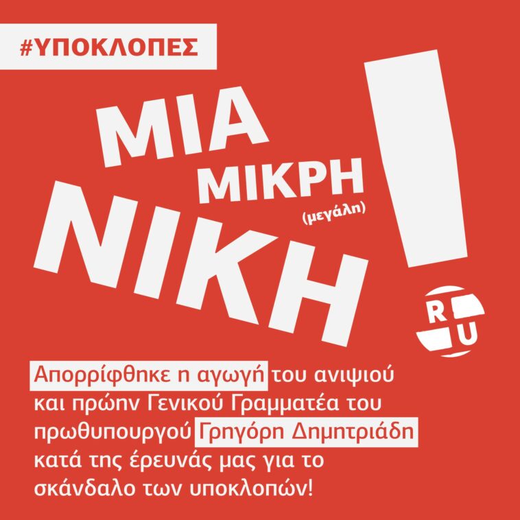 Πραγματική δικαίωση της δημοσιογραφικής έρευνας για το σκάνδαλο των υποκλοπών αλλά και μια δικαίωση σε όσους-ες αγωνίζονται στο να μπει ένα φρένο στις καταχρηστικές και αβάσιμες αγωγές και τον φόβο που προκαλούν αποτελεί η απόφαση του δικαστηρίου της 4ης Οκτωβρίου που απορρίπτει την αγωγή SLAPP του ανιψιού και πρώην Γενικού Γραμματέα του πρωθυπουργού Γρηγόρη Δημητριάδη κατά του Reporters United και της Εφημερίδας των Συντακτών.