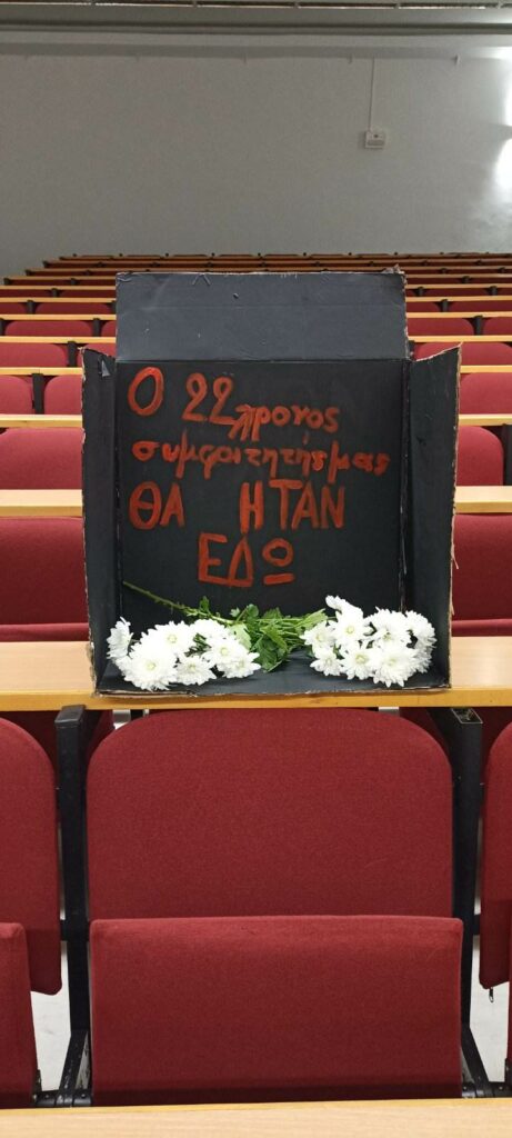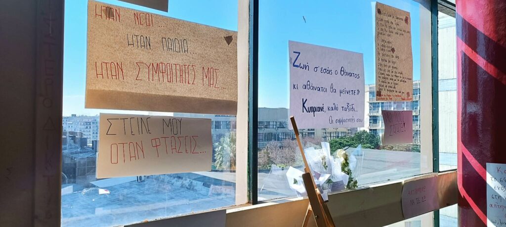 Άλλοι φοιτητές λένε ότι «μετρηθήκαμε και βγήκαμε λιγότεροι» ενώ άλλες γράφουν τις σκέψεις τους για όσα συνέβησαν. Όλοι-ες οι φοιτητές-τριες που σκοτώθηκαν στα Τέμπη ήταν από 18 μέχρι 28 ετών. Πιο πέρα, στη Νομική Σχολή στον 3ο όροφο, φοιτητές έχουν αφήσει λουλούδια μπροστά σε μια φωτογραφία του Κυπριανού, στο Τοπογράφων Μηχανικών δίνεται η υπόσχεση ότι η Αγάπη δε θα ξεχαστεί, στο Φυσικό σε μια άδεια αίθουσα ένα μαύρο κουτί με άσπρα γαρύφαλλα στη θέση που καθόταν ο 22χρονος Γιώργος. «Μου λείπεις», «Θα βρεθούμε Θεσσαλονίκη» ήταν φράσεις που έλεγαν στις κουβέντες τους στα social media και στα τηλέφωνα πριν και κατά τη διάρκεια ενός δρομολογίου που κάνουν συχνά φοιτητές και καθηγητές του πανεπιστημίου. Γνωρίζουν όλοι και όλες ότι θα μπορούσαν να βρίσκονται σε αυτό το τρένο.