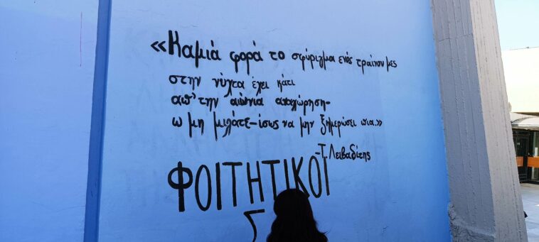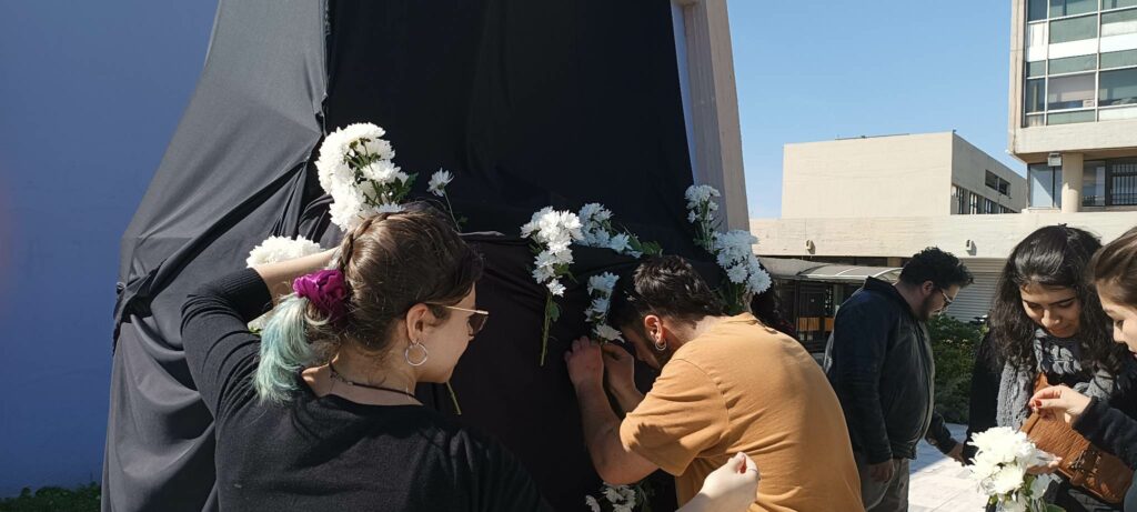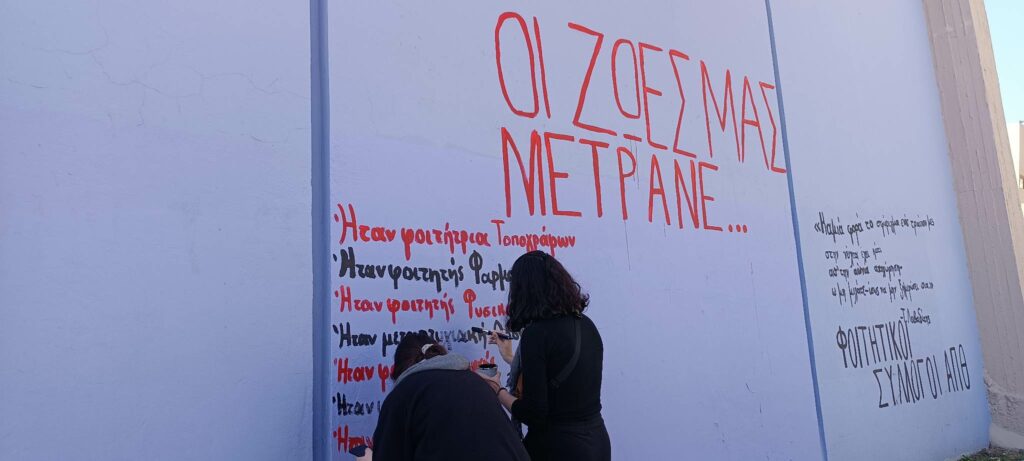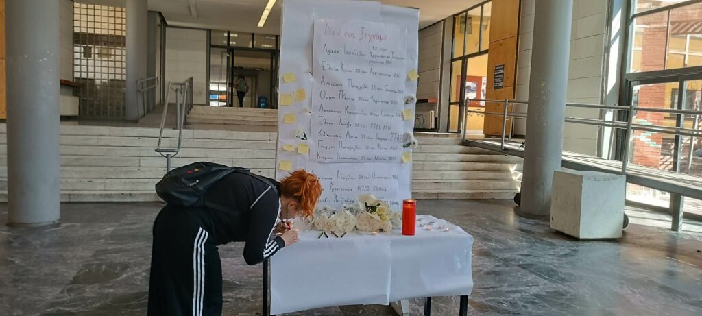 Οργισμένα συνθήματα, πένθιμα μηνύματα, φωτογραφίες παιδιών και άσπρα γαρύφαλλα στα σκαλοπάτια, στις αίθουσες, στις εισόδους των σχολών διατηρούν τη μνήμη για τους φοιτητές-τριες του ΑΠΘ και του ΠΑΜΑΚ που χάθηκαν στο έγκλημα στα Τέμπη αλλά και για όσους-ες τραυματίστηκαν και νοσηλεύονται στα νοσοκομεία. Τα ονόματά τους και η σχολή στην οποία φοιτούσαν γράφονται σε ένα αυτοσχέδιο μνημείο που έφτιαξαν φοιτητές-τριες στην είσοδο του Πολυτεχνείου.