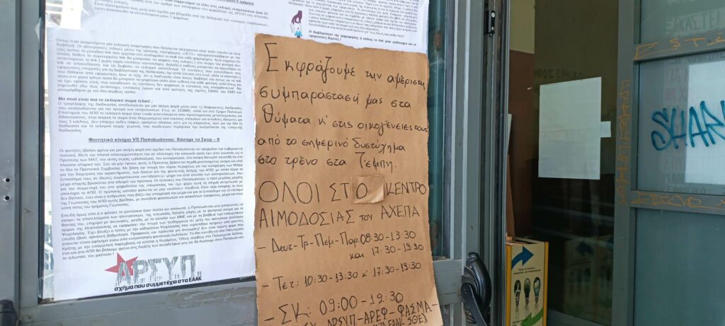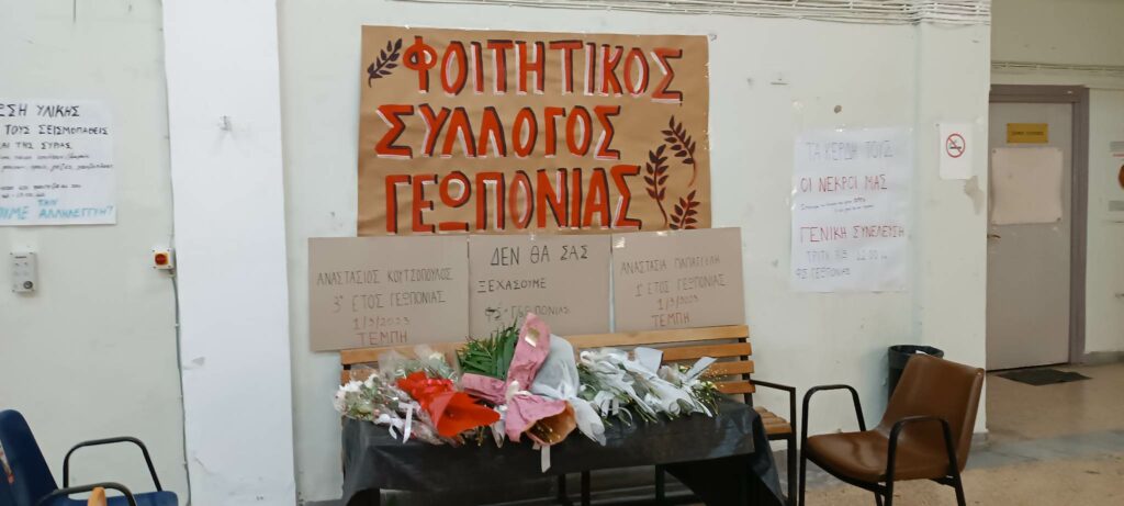 Τα πένθη προστίθενται και αυξάνονται. Στο Γεωπονικό δίπλα σε ένα κάλεσμα για τη συλλογή ανθρωπιστικής βοήθειας στους-ις πληγέντες-είσες του φονικού σεισμού στην Τουρκία και τη Συρία βρίσκεται το «μνημείο» για τον Αναστάσιο και την Αναστασία που χάθηκαν, επίσης, στα Τέμπη. Στις εισόδους των σχολών βρίσκονται ακόμη αναρτημένα τα καλέσματα των προηγούμενων ημερών για αιμοδοσία στα νοσοκομεία της πόλης. Παντού καταγράφεται η πεποίθηση ότι αυτό που έγινε στα Τέμπη ήταν δολοφονία. Δεν υπάρχει κανείς και καμία που να πιστεύει πλέον ότι πρόκειται μόνο για ένα ανθρώπινο λάθος. Η θλίψη έχει γίνει οργή. Οι φοιτητές-τριες το ξέρουν καλά ότι οι ζωές μας δεν μετράνε, αντίθετα θυσιάζονται καθημερινά στη ζυγαριά κόστους-οφέλους που έχουν εγκαθιδρύσει οι κυβερνήσεις σε όλους τους τομείς της ζωής μας. Από το πανεπιστήμιο, την υγεία μέχρι το νερό και την εκπαίδευση. Η συγνώμη του πρωθυπουργού δεν γίνεται δεκτή.