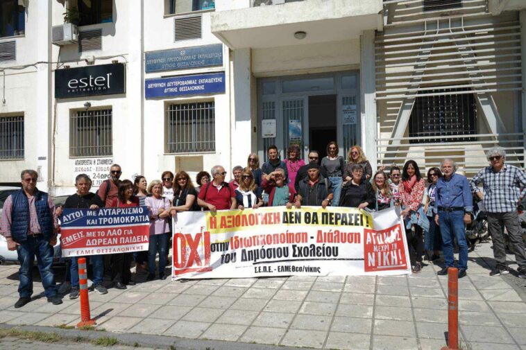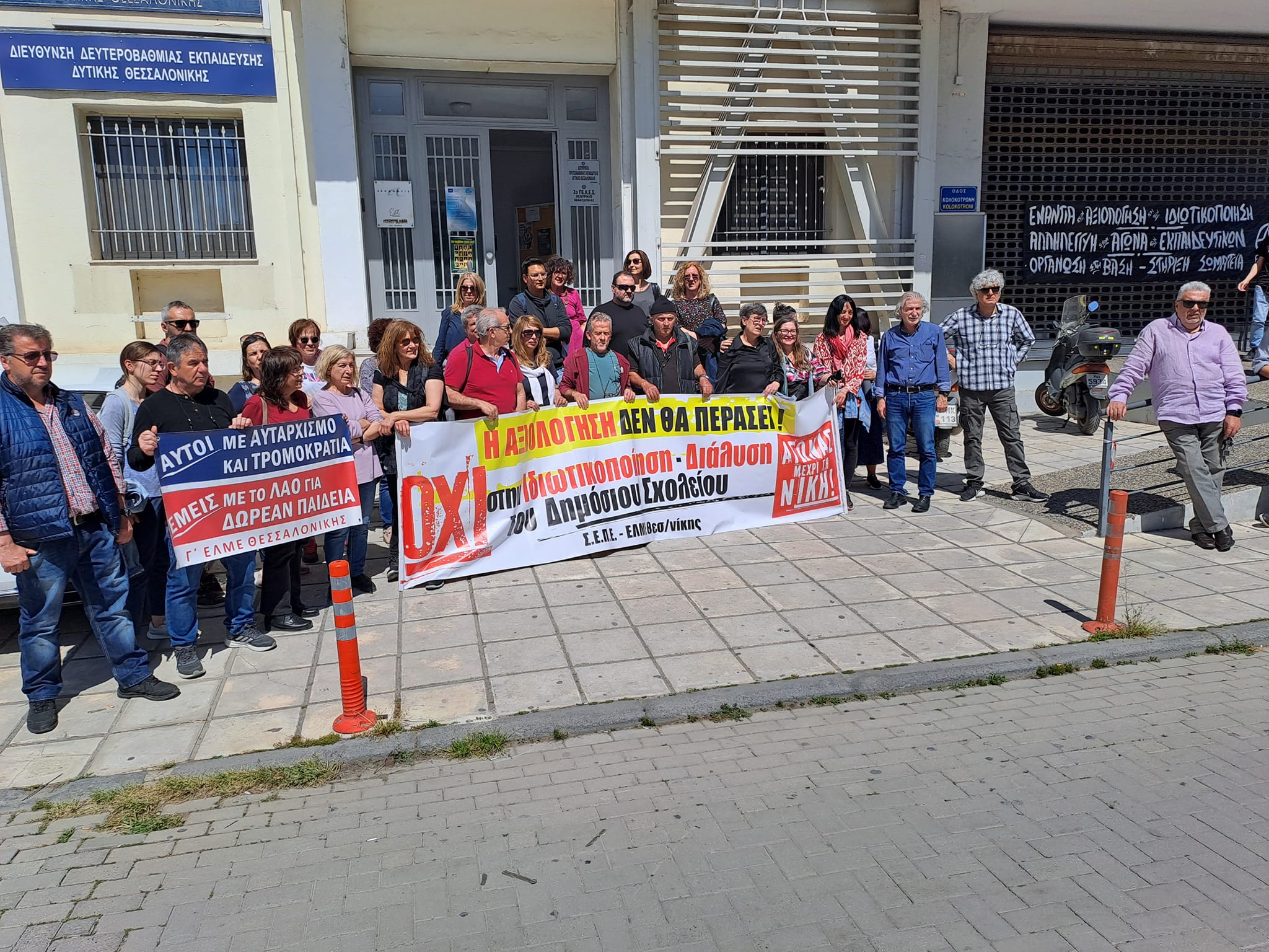 Μαζική παρέμβαση πραγματοποίησαν σήμερα Σύλλογοι Εκπαιδευτικών και οι ΕΛΜΕ της Θεσσαλονίκης στις Δ/νσεις Πρωτοβάθμιας και Δευτεροβάθμιας εκπαίδευσης ενάντια στην αξιολόγηση και τον αυταρχισμό με το οποίο προσπαθεί η κυβέρνηση να τρομοκρατήσει τους εκπαιδευτικούς που δηλώνουν απεργία-αποχή κατά της αξιολόγησης, ασκώντας το συνταγματικό δικαίωμα της απεργίας.