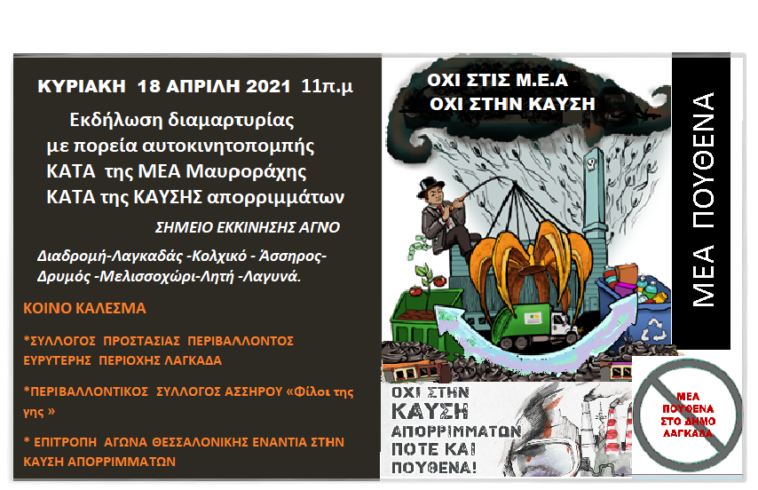 Κοινό κάλεσμα για την συγκεκριμένη πρωτοβουλία έχουν απευθύνει ο Σύλλογος Προστασίας Περιβάλλοντος Ευρύτερης Περιοχής Λαγκαδά, ο Περιβαλλοντικός Σύλλογος Ασσήρου «Φίλοι της γης» και η Επιτροπή Αγώνα Θεσσαλονίκης Ενάντια στην Καύση Απορριμμάτων.