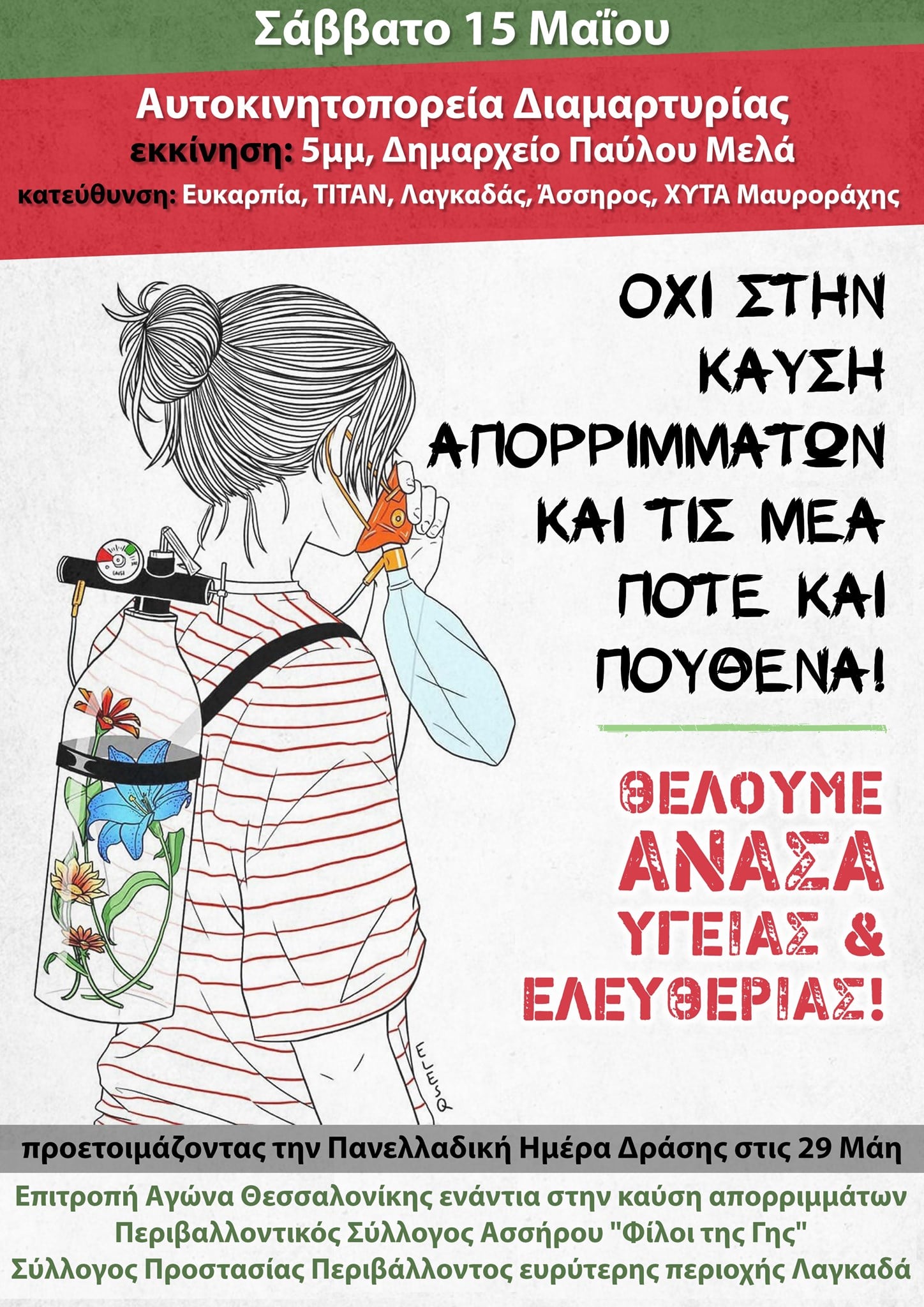 Με δεκάδες αυτοκίνητα πραγματοποιήθηκε, το Σάββατο 15 Μαΐου, αυτοκινητοπομπή ενάντια στην καύση των απορριμμάτων και τις ΜΕΑ. Η πορεία ξεκίνησε από το Δημαρχείο Παύλου Μελά διασχίζοντας την Ευκαρπία, περνώντας από το εργοστάσιο ΤΙΤΑΝ και συνεχίζοντας στον Λαγκαδά, στην Άσσηρο και στην Μαυροράχη, όπου και πραγματοποιήθηκαν στάσεις για να ενημερωθεί ο τοπικός πληθυσμός για τις συνέπειες της καύσης απορριμμάτων.