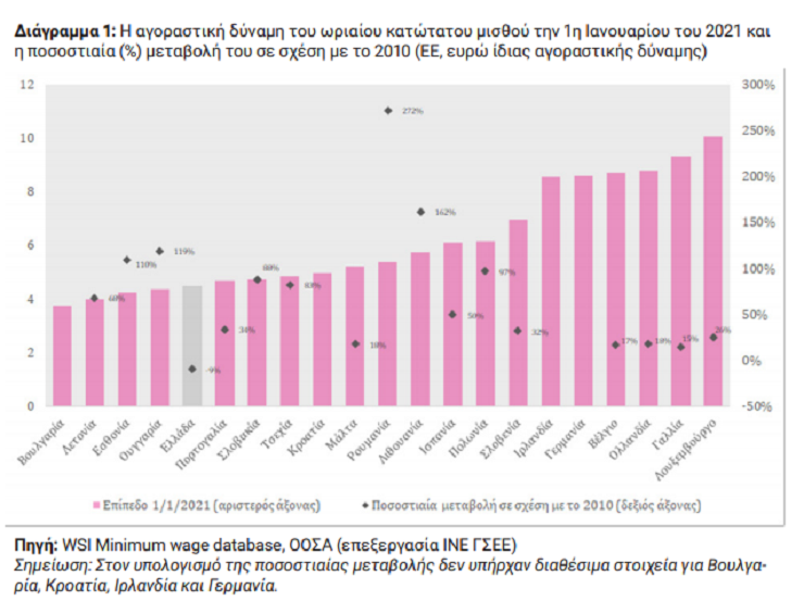 Σύμφωνα με τη μελέτη, η αγοραστική δύναμη του κατώτατου μισθού στην Ελλάδα είναι η 5η χαμηλότερη σε όλη την ΕΕ, πάνω μόνο από την Ουγγαρία, την Λετονία, την Εσθονία και την Βουλγαρία. Επιπλέον, η Ελλάδα είναι το μόνο κράτος-μέλος το οποίο υπέστη απώλεια αγοραστικής δύναμης του κατώτατου μισθού σε σχέση με το επίπεδο του 2010 (-9,45%), όταν στα υπόλοιπα κράτη-μέλη υπήρξε πολύ μεγάλη αύξηση.