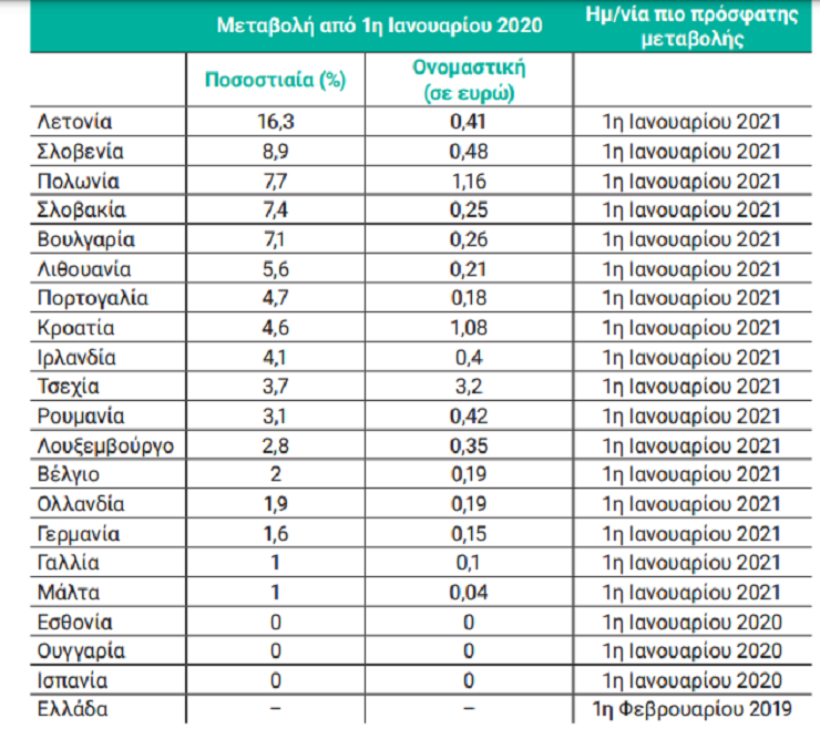 Σημειώνεται, ότι στη χώρα μας, ακόμη, περίπου μέσα του 2021, δεν έχει αποφασιστεί καμία μεταβολή του κατώτατου μισθού. Επίσης πρέπει να αναφερθεί ότι από τις 17 χώρες που αύξησαν τον κατώτατο μισθό το 2021, οι 14 τον είχαν αυξήσει και το 2020 σε σχέση με το 2019. Παράλληλα, ανάμεσα στις χώρες που διατηρήσαν την 1η Ιανουαρίου του 2021 τον κατώτατο μισθό σταθερό σε σχέση με την 1η Ιανουαρίου του 2020, η Εσθονία και η Ισπανία, είχαν ήδη αυξήσει τον ωριαίο κατώτατο μισθό σε σχέση με το 2019 κατά 8,15% και 5,55%. Για το 2021, υψηλότερη ήταν η αύξηση του ωριαίου κατώτατου μισθού στη Λετονία (16,3%) και χαμηλότερη στη Γαλλία και στη Μάλτα (1%). Ακολουθεί σχετικός πίνακας: