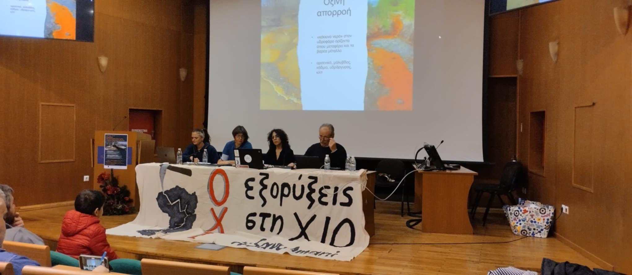 Στο πανεπιστήμιο Αιγαίου, στο πλαίσιο της εκδήλωσης μίλησαν ο Αλέξης Μπένος, καθηγητής υγιεινής, κοινωνικής ιατρικής και Α΄βάθμιας φροντίδας υγείας του ΑΠΘ και τρια μέλη της Επιτροπής Αγώνα Μ. Παναγιάς κατά των εξορύξεων χρυσού χαλκού στη ΒΑ Χαλκιδική (Σκουριές) μετά από πρόσκληση της Συντονιστικής επιτροπής δράσης και ενημέρωσης για το αντιμόνιο .