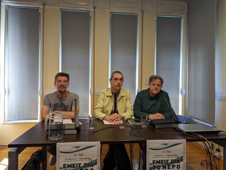«Δέκα χρόνια μετά το δημοψήφισμα είμαστε ακόμα εδώ, οι αγώνες για να παραμείνει το νερό δημόσιο αγαθό συνεχίζονται», επεσήμανε μεταξύ σε συνέντευξη Τύπου ο γραμματέας του Σωματείου Εργαζομένων της ΕΥΑΘ Γιάννης Μήτζιας.