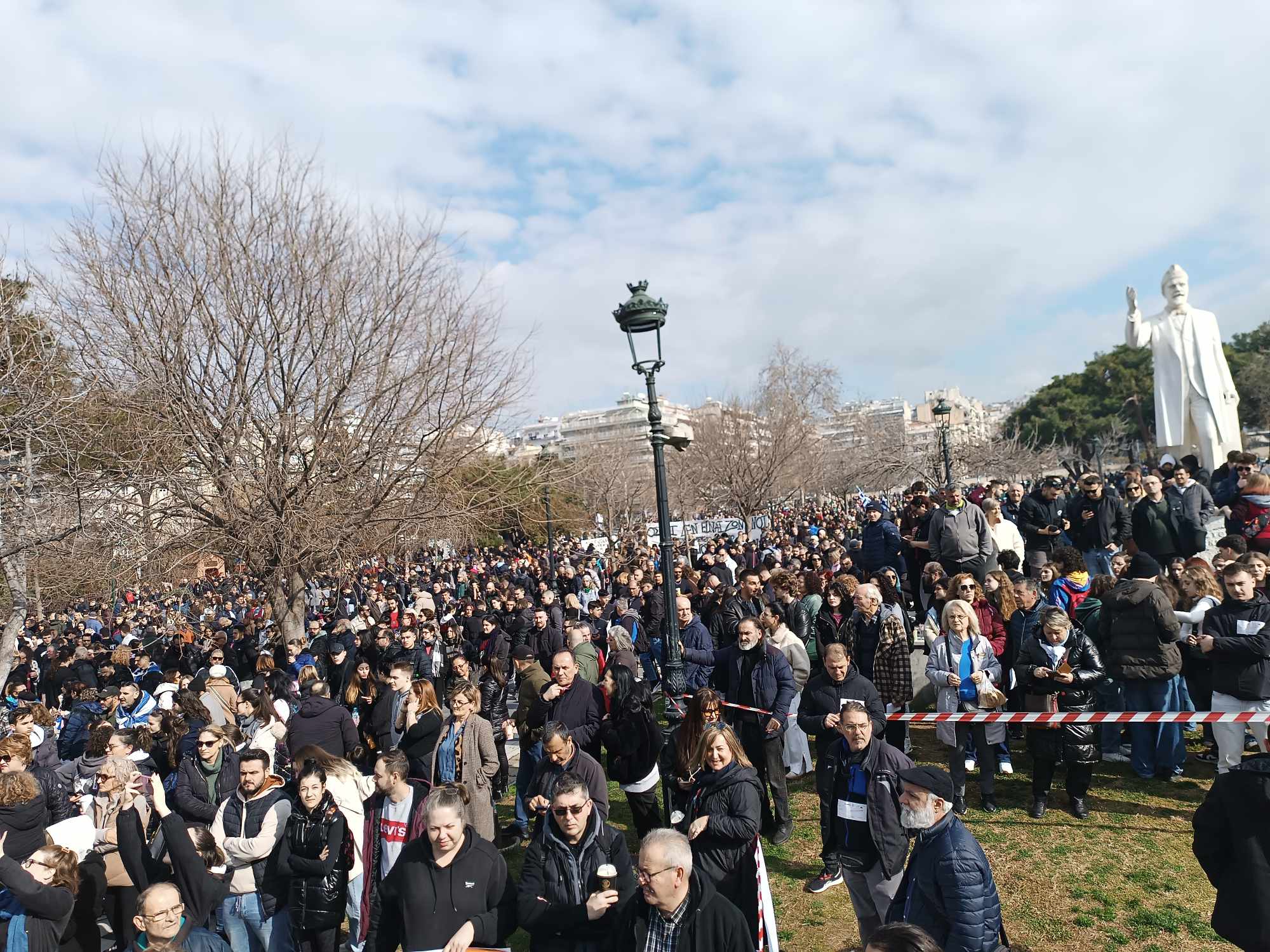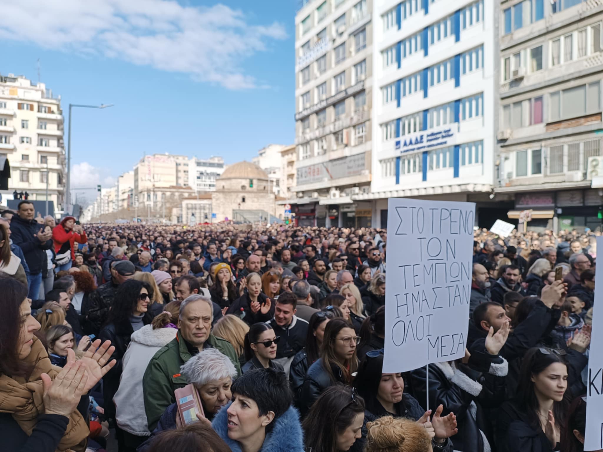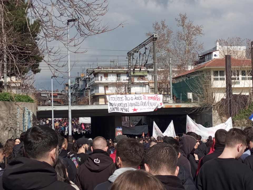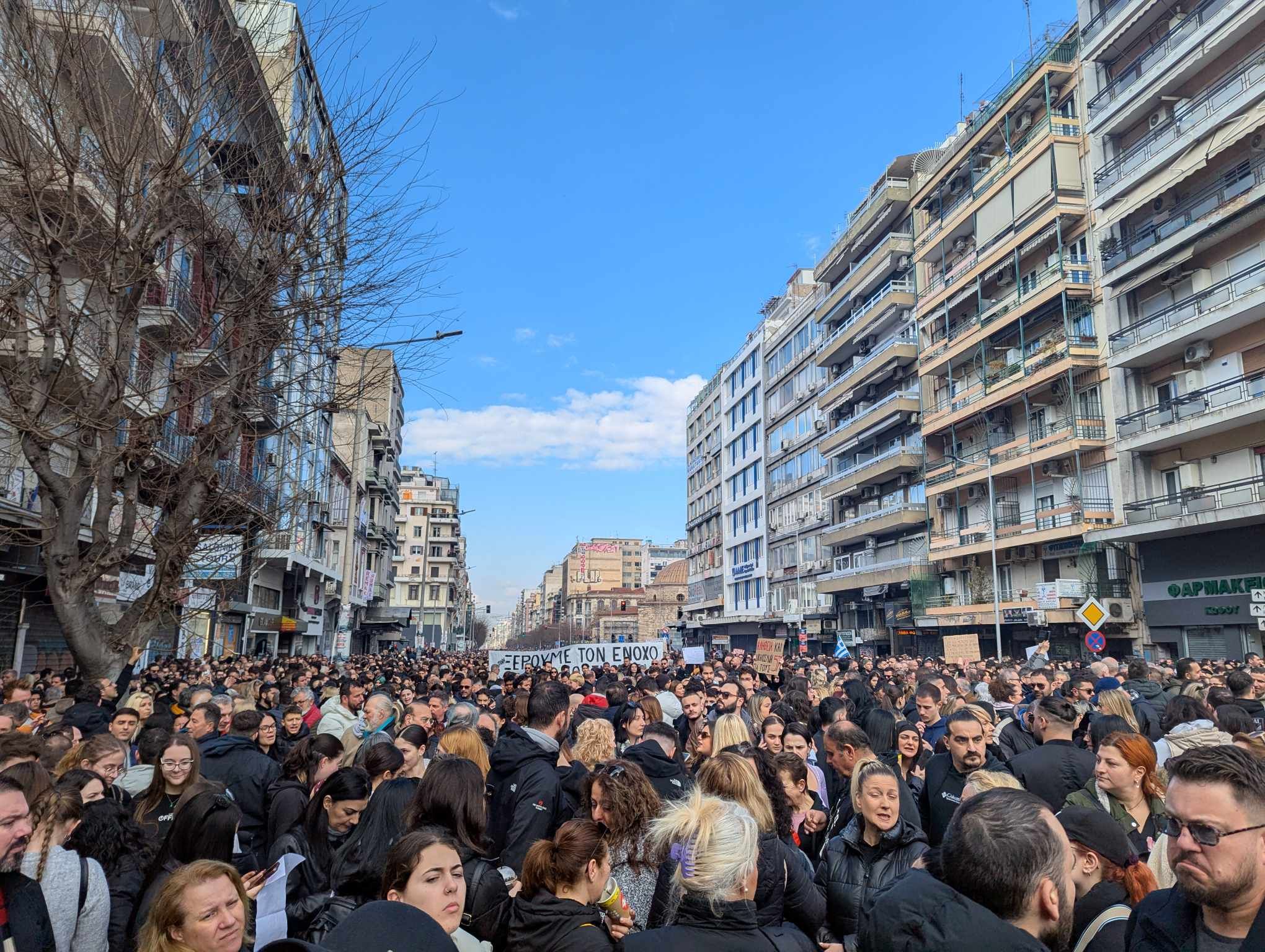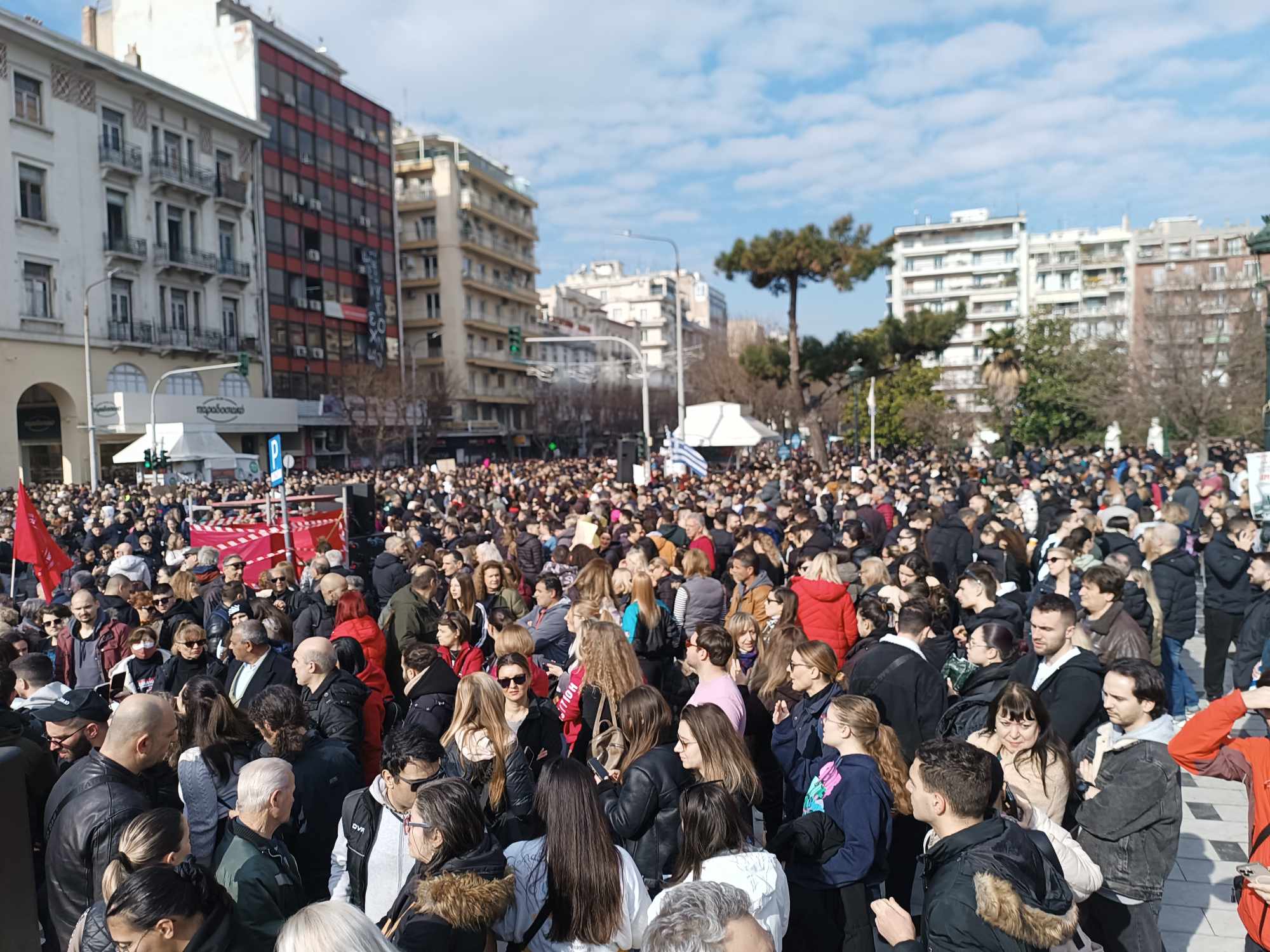 Μεγαλειώδες συλλαλητήριο με αίτημα τη δικαίωση των θυμάτων του εγκλήματος των Τεμπών πραγματοποιήθηκε και στη Θεσσαλονίκη στο πλαίσιο της 24ωρης απεργίας των συνδικάτων. Όλες οι κεντρικές αρτηρίες αλλά και τα στενά του κέντρου της πόλης γέμισαν ασφυκτικά ενώ η συγκέντρωση του κόσμου εκτεινόταν από τον ΟΣΕ μέχρι και την Παπάφη. Από νωρίς το πρωί «ποτάμια» ανθρώπων κατέβαιναν προς το άγαλμα Βενιζέλου αλλά και στα σημεία όπου είχαν οριστεί οι προσυγκεντρώσεις των εργατικών σωματείων, των συλλόγων και των πολιτικών οργανώσεων. Επί ώρες ήταν αδύνατο να μετακινηθεί κανείς σε ακτίνα χιλιομέτρων. Εκατοντάδες χιλιάδες άνθρωποι άκουσαν από τα μεγάφωνα τις ομιλίες των συγγενών των θυμάτων και εργαζόμενων στον σιδηρόδρομο ενώ κατά διαστήματα ακούγονταν η λέξη «αθάνατοι». Στις τοποθετήσεις τους μίλησαν για τις συνεχείς απόπειρες συγκάλυψης του εγκλήματος αλλά και των βαθύτερων αιτιών του ενώ παράλληλα ζήτησαν ασφαλείς και δημόσιες μεταφορές. Στα πανό και τα πλακάτ των διαδηλωτών κυριαρχούσαν τα συνθήματα «δεν έχω οξυγόνο», «δικαίωση», «δεν ήταν ατύχημα, ήταν έγκλημα», «όσο χώμα και αν ρίξετε, η αλήθεια δε θάβεται», «η ιδιωτικοποίηση δολοφονεί» «δε συγχωρούμε» ενώ σε πολλά πανό αναγράφονταν τα ονόματα των θυμάτων. Ιδιαίτερα μαζικά ήταν τα μπλοκ των μαθητών-τριών δημόσιων και ιδιωτικών σχολείων όλων των βαθμίδων, των φοιτητών-τριών, των εκπαιδευτικών και των πανεπιστημιακών αλλά και εργατικών σωματείων που απεργούσαν ακόμη και σε κλάδους που παλαιότερα θεωρούνταν αδιανόητο. Εργαζόμενοι-ες σε σουπερμάρκετ, ιδιωτικά θεραπευτήρια, νοσοκοκομειακοί γιατροί, διοικητικοί υπάλληλοι, μισθωτοί, εργαζόμενοι σε εργοστάσια της πόλης. Υπήρχαν, ακόμη, ξεχωριστά πανό και μπλοκ για κάθε ένα από τα θύματα του εγκλήματος των Τεμπών με συγγενείς και φίλους να τα ακολουθούν. Ιδιαίτερος παλμός δόθηκε από τους καλλιτέχνες-ιδες των δραματικών σχολών αλλά και από όλο εκείνο το πλήθος που φώναζε «δολοφόνοι». «Όταν ένα παιδί λέει δεν έχω οξυγόνο, αυτό είναι που κάνει το κράτος δολοφόνο». Το «παρών» έδωσαν με μαζικά μπλοκ οπαδοί αθλητικών ομάδων της πόλης αλλά και μέλη της Ρομά κοινότητας που εξέφραζαν την οργή τους για τις δολοφονίες συνανθρώπων τους. Οι διαδηλωτές μίλησαν και για τα υπόλοιπα «Τέμπη» που έχουν συμβεί στη χώρα με θύματα μετανάστες και προσφύγισσες, όπως στο ναυάγιο στην Πύλο κάνοντας λόγο για «κράτος δολοφόνο». Μετά το προσκλητήριο νεκρών στο άγαλμα Βενιζέλου πραγματοποιήθηκε διαδήλωση μέχρι τον ΟΣΕ, όπου για πάνω από 2 ώρες υπήρχε συνεχής ροή από κόσμο που περνούσε και περικύκλωνε τον σταθμό των τρένων. Η διαδρομή συνεχίστηκε από την Αγ. Πάντων προς το ΥΜΑΘ όπου και ολοκληρώθηκε η κινητοποίηση, ενώ μικρής έντασης επεισόδια συνέβησαν μπροστά στον ΟΣΕ εξαιτίας της προκλητικής παρουσίας ανδρών των ΜΑΤ, καθώς και στην Αγ. Δημητρίου, όπου οι διαδηλωτές αποδοκίμαζαν την παρουσία της αστυνομίας.