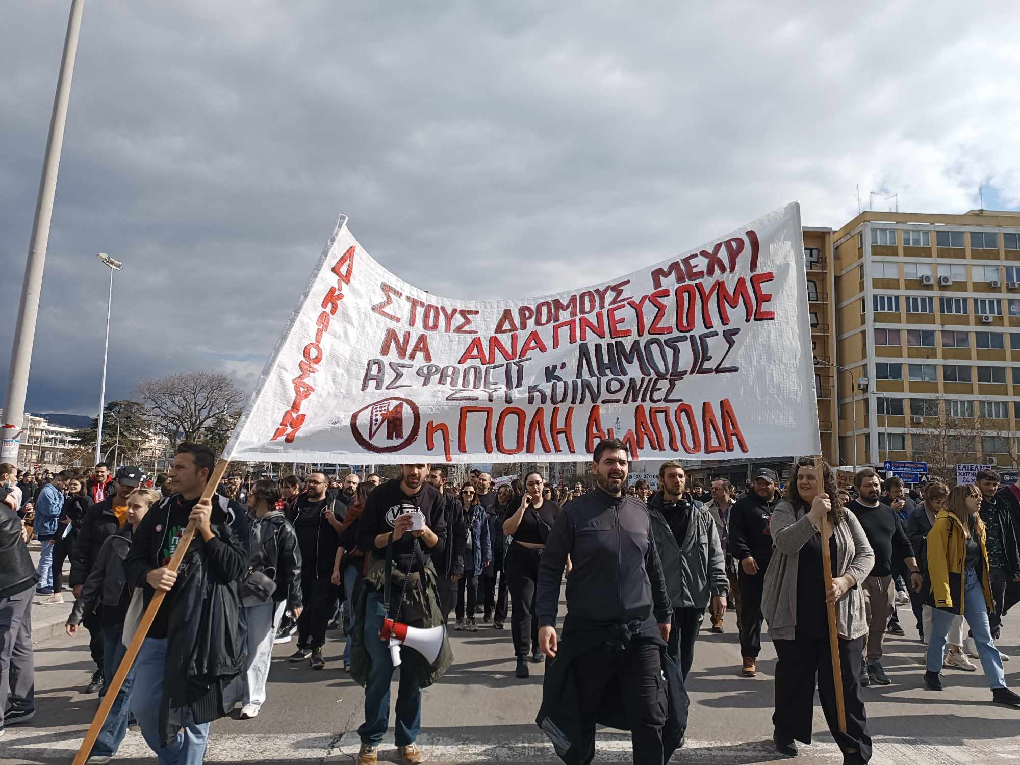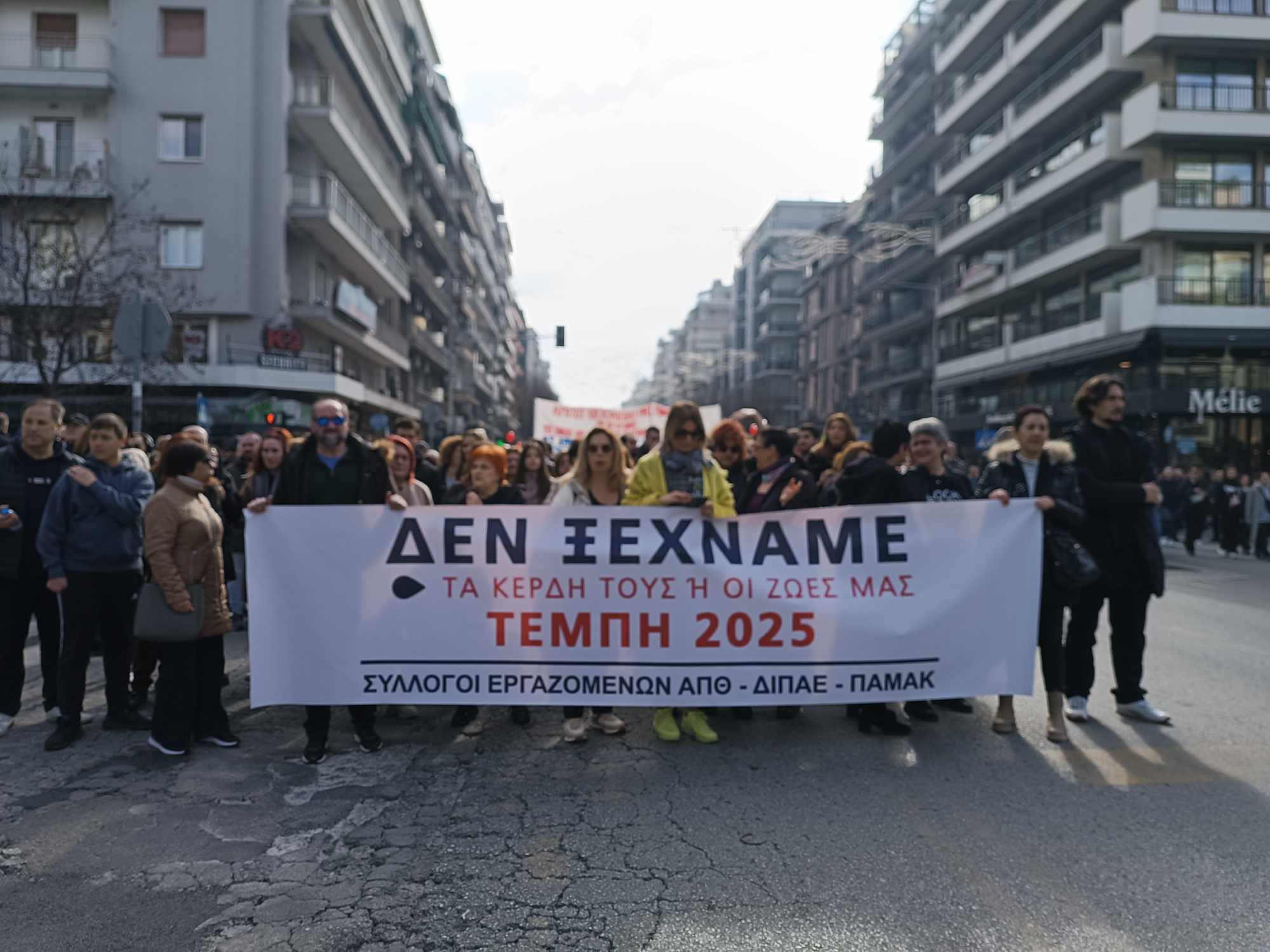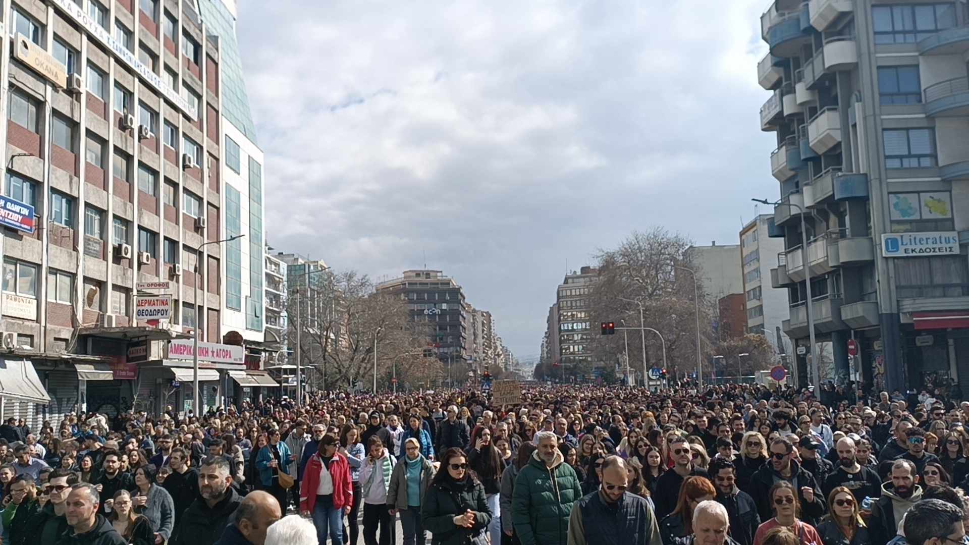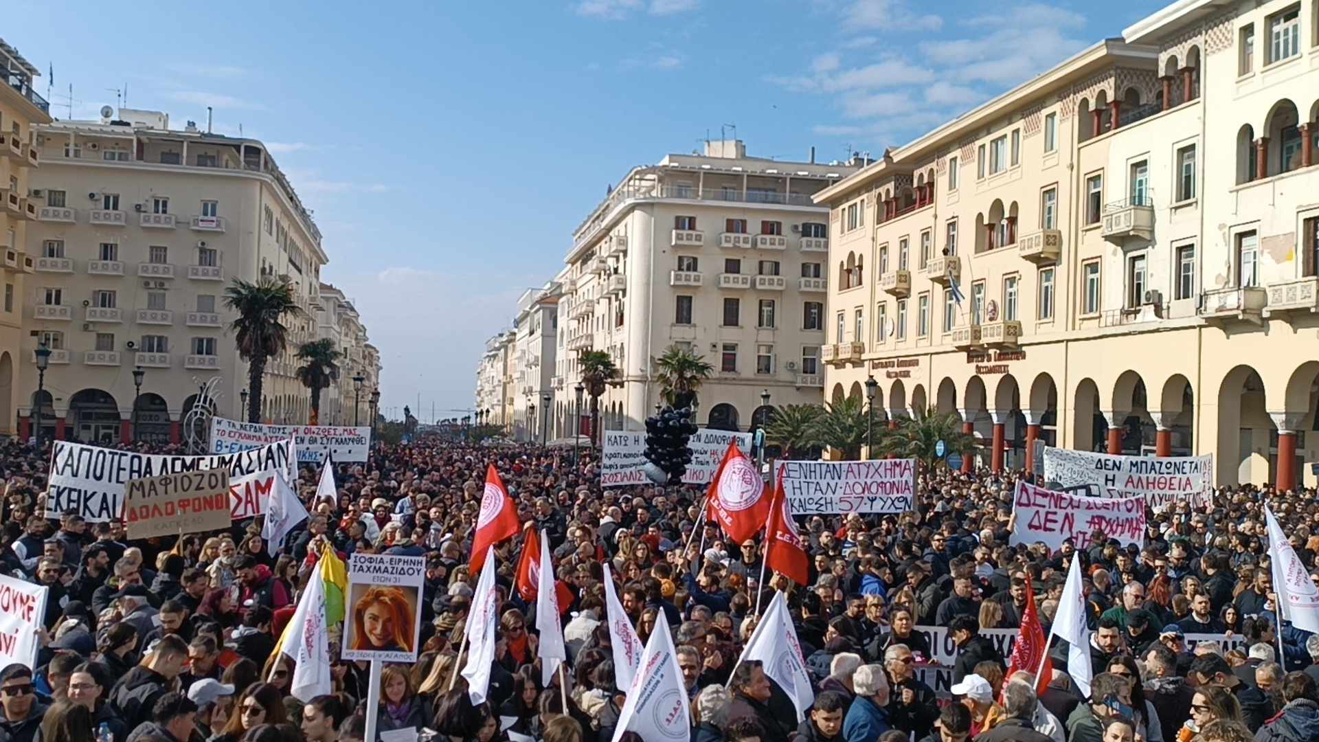 Μεγαλειώδες συλλαλητήριο με αίτημα τη δικαίωση των θυμάτων του εγκλήματος των Τεμπών πραγματοποιήθηκε και στη Θεσσαλονίκη στο πλαίσιο της 24ωρης απεργίας των συνδικάτων. Όλες οι κεντρικές αρτηρίες αλλά και τα στενά του κέντρου της πόλης γέμισαν ασφυκτικά ενώ η συγκέντρωση του κόσμου εκτεινόταν από τον ΟΣΕ μέχρι και την Παπάφη. Από νωρίς το πρωί «ποτάμια» ανθρώπων κατέβαιναν προς το άγαλμα Βενιζέλου αλλά και στα σημεία όπου είχαν οριστεί οι προσυγκεντρώσεις των εργατικών σωματείων, των συλλόγων και των πολιτικών οργανώσεων. Επί ώρες ήταν αδύνατο να μετακινηθεί κανείς σε ακτίνα χιλιομέτρων. Εκατοντάδες χιλιάδες άνθρωποι άκουσαν από τα μεγάφωνα τις ομιλίες των συγγενών των θυμάτων και εργαζόμενων στον σιδηρόδρομο ενώ κατά διαστήματα ακούγονταν η λέξη «αθάνατοι». Στις τοποθετήσεις τους μίλησαν για τις συνεχείς απόπειρες συγκάλυψης του εγκλήματος αλλά και των βαθύτερων αιτιών του ενώ παράλληλα ζήτησαν ασφαλείς και δημόσιες μεταφορές. Στα πανό και τα πλακάτ των διαδηλωτών κυριαρχούσαν τα συνθήματα «δεν έχω οξυγόνο», «δικαίωση», «δεν ήταν ατύχημα, ήταν έγκλημα», «όσο χώμα και αν ρίξετε, η αλήθεια δε θάβεται», «η ιδιωτικοποίηση δολοφονεί» «δε συγχωρούμε» ενώ σε πολλά πανό αναγράφονταν τα ονόματα των θυμάτων. Ιδιαίτερα μαζικά ήταν τα μπλοκ των μαθητών-τριών δημόσιων και ιδιωτικών σχολείων όλων των βαθμίδων, των φοιτητών-τριών, των εκπαιδευτικών και των πανεπιστημιακών αλλά και εργατικών σωματείων που απεργούσαν ακόμη και σε κλάδους που παλαιότερα θεωρούνταν αδιανόητο. Εργαζόμενοι-ες σε σουπερμάρκετ, ιδιωτικά θεραπευτήρια, νοσοκοκομειακοί γιατροί, διοικητικοί υπάλληλοι, μισθωτοί, εργαζόμενοι σε εργοστάσια της πόλης. Υπήρχαν, ακόμη, ξεχωριστά πανό και μπλοκ για κάθε ένα από τα θύματα του εγκλήματος των Τεμπών με συγγενείς και φίλους να τα ακολουθούν. Ιδιαίτερος παλμός δόθηκε από τους καλλιτέχνες-ιδες των δραματικών σχολών αλλά και από όλο εκείνο το πλήθος που φώναζε «δολοφόνοι». «Όταν ένα παιδί λέει δεν έχω οξυγόνο, αυτό είναι που κάνει το κράτος δολοφόνο». Το «παρών» έδωσαν με μαζικά μπλοκ οπαδοί αθλητικών ομάδων της πόλης αλλά και μέλη της Ρομά κοινότητας που εξέφραζαν την οργή τους για τις δολοφονίες συνανθρώπων τους. Οι διαδηλωτές μίλησαν και για τα υπόλοιπα «Τέμπη» που έχουν συμβεί στη χώρα με θύματα μετανάστες και προσφύγισσες, όπως στο ναυάγιο στην Πύλο κάνοντας λόγο για «κράτος δολοφόνο». Μετά το προσκλητήριο νεκρών στο άγαλμα Βενιζέλου πραγματοποιήθηκε διαδήλωση μέχρι τον ΟΣΕ, όπου για πάνω από 2 ώρες υπήρχε συνεχής ροή από κόσμο που περνούσε και περικύκλωνε τον σταθμό των τρένων. Η διαδρομή συνεχίστηκε από την Αγ. Πάντων προς το ΥΜΑΘ όπου και ολοκληρώθηκε η κινητοποίηση, ενώ μικρής έντασης επεισόδια συνέβησαν μπροστά στον ΟΣΕ εξαιτίας της προκλητικής παρουσίας ανδρών των ΜΑΤ, καθώς και στην Αγ. Δημητρίου, όπου οι διαδηλωτές αποδοκίμαζαν την παρουσία της αστυνομίας.