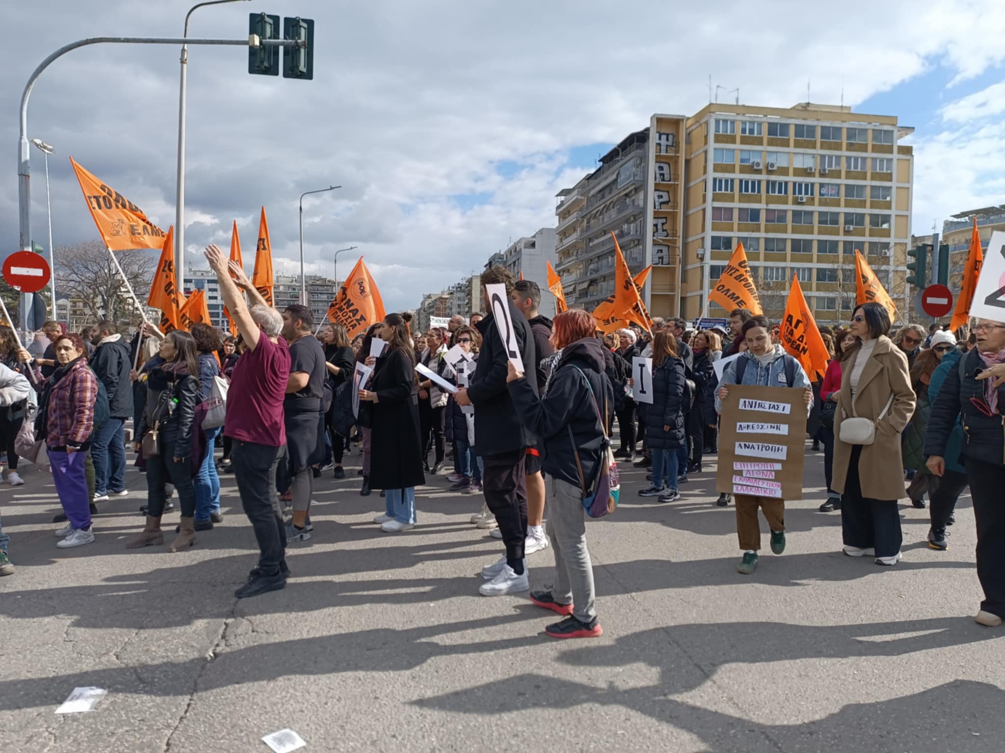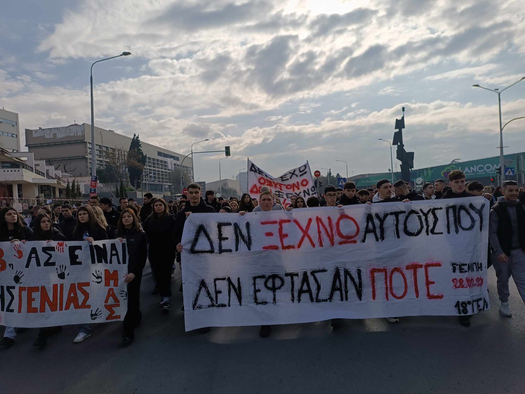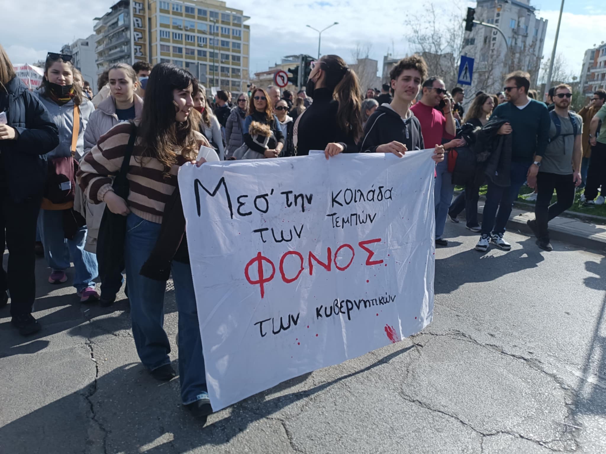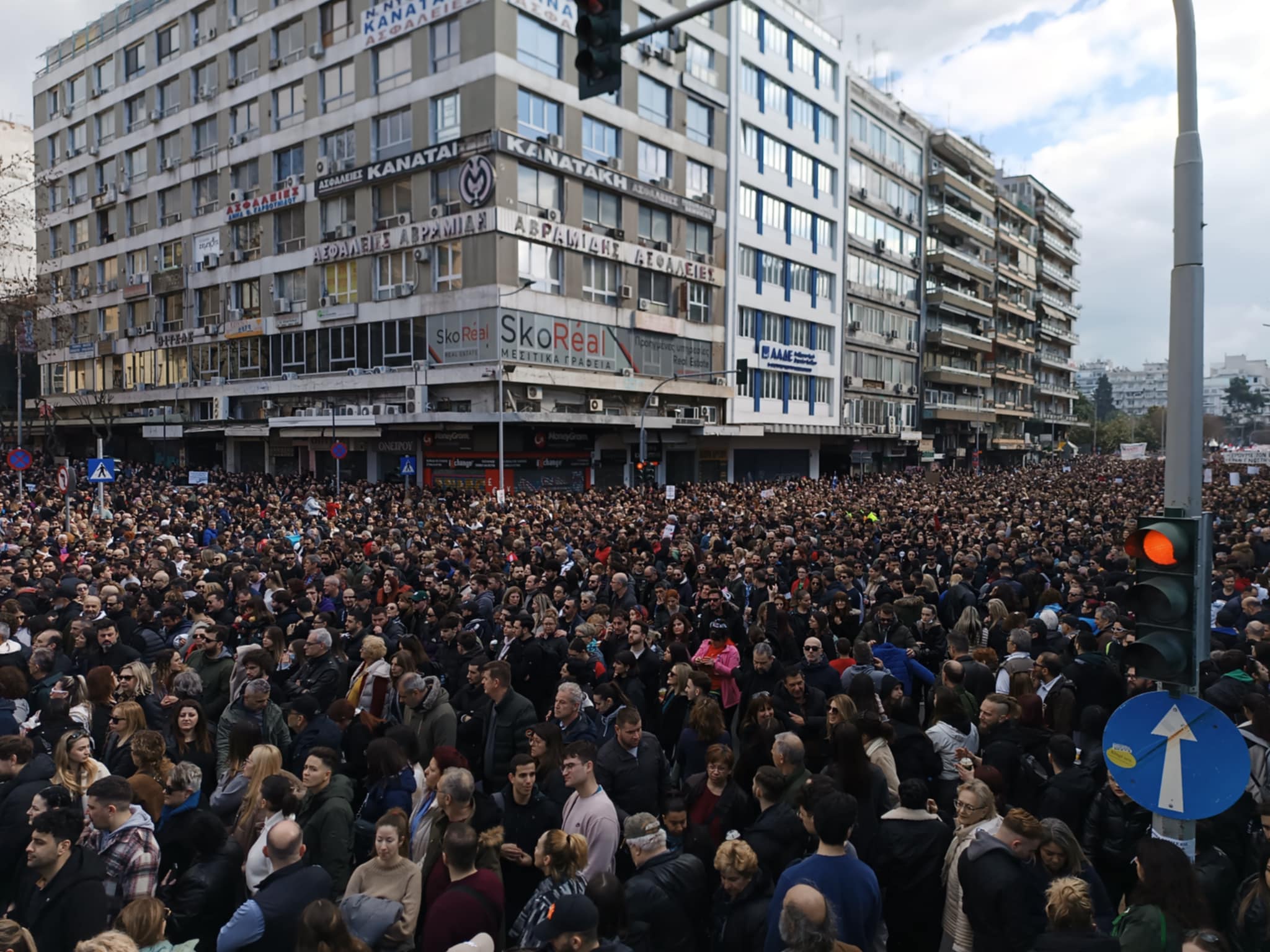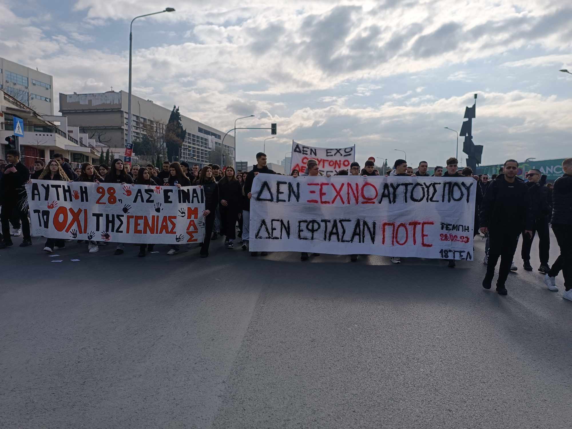 Μεγαλειώδες συλλαλητήριο με αίτημα τη δικαίωση των θυμάτων του εγκλήματος των Τεμπών πραγματοποιήθηκε και στη Θεσσαλονίκη στο πλαίσιο της 24ωρης απεργίας των συνδικάτων. Όλες οι κεντρικές αρτηρίες αλλά και τα στενά του κέντρου της πόλης γέμισαν ασφυκτικά ενώ η συγκέντρωση του κόσμου εκτεινόταν από τον ΟΣΕ μέχρι και την Παπάφη. Από νωρίς το πρωί «ποτάμια» ανθρώπων κατέβαιναν προς το άγαλμα Βενιζέλου αλλά και στα σημεία όπου είχαν οριστεί οι προσυγκεντρώσεις των εργατικών σωματείων, των συλλόγων και των πολιτικών οργανώσεων. Επί ώρες ήταν αδύνατο να μετακινηθεί κανείς σε ακτίνα χιλιομέτρων. Εκατοντάδες χιλιάδες άνθρωποι άκουσαν από τα μεγάφωνα τις ομιλίες των συγγενών των θυμάτων και εργαζόμενων στον σιδηρόδρομο ενώ κατά διαστήματα ακούγονταν η λέξη «αθάνατοι». Στις τοποθετήσεις τους μίλησαν για τις συνεχείς απόπειρες συγκάλυψης του εγκλήματος αλλά και των βαθύτερων αιτιών του ενώ παράλληλα ζήτησαν ασφαλείς και δημόσιες μεταφορές. Στα πανό και τα πλακάτ των διαδηλωτών κυριαρχούσαν τα συνθήματα «δεν έχω οξυγόνο», «δικαίωση», «δεν ήταν ατύχημα, ήταν έγκλημα», «όσο χώμα και αν ρίξετε, η αλήθεια δε θάβεται», «η ιδιωτικοποίηση δολοφονεί» «δε συγχωρούμε» ενώ σε πολλά πανό αναγράφονταν τα ονόματα των θυμάτων. Ιδιαίτερα μαζικά ήταν τα μπλοκ των μαθητών-τριών δημόσιων και ιδιωτικών σχολείων όλων των βαθμίδων, των φοιτητών-τριών, των εκπαιδευτικών και των πανεπιστημιακών αλλά και εργατικών σωματείων που απεργούσαν ακόμη και σε κλάδους που παλαιότερα θεωρούνταν αδιανόητο. Εργαζόμενοι-ες σε σουπερμάρκετ, ιδιωτικά θεραπευτήρια, νοσοκοκομειακοί γιατροί, διοικητικοί υπάλληλοι, μισθωτοί, εργαζόμενοι σε εργοστάσια της πόλης. Υπήρχαν, ακόμη, ξεχωριστά πανό και μπλοκ για κάθε ένα από τα θύματα του εγκλήματος των Τεμπών με συγγενείς και φίλους να τα ακολουθούν. Ιδιαίτερος παλμός δόθηκε από τους καλλιτέχνες-ιδες των δραματικών σχολών αλλά και από όλο εκείνο το πλήθος που φώναζε «δολοφόνοι». «Όταν ένα παιδί λέει δεν έχω οξυγόνο, αυτό είναι που κάνει το κράτος δολοφόνο». Το «παρών» έδωσαν με μαζικά μπλοκ οπαδοί αθλητικών ομάδων της πόλης αλλά και μέλη της Ρομά κοινότητας που εξέφραζαν την οργή τους για τις δολοφονίες συνανθρώπων τους. Οι διαδηλωτές μίλησαν και για τα υπόλοιπα «Τέμπη» που έχουν συμβεί στη χώρα με θύματα μετανάστες και προσφύγισσες, όπως στο ναυάγιο στην Πύλο κάνοντας λόγο για «κράτος δολοφόνο». Μετά το προσκλητήριο νεκρών στο άγαλμα Βενιζέλου πραγματοποιήθηκε διαδήλωση μέχρι τον ΟΣΕ, όπου για πάνω από 2 ώρες υπήρχε συνεχής ροή από κόσμο που περνούσε και περικύκλωνε τον σταθμό των τρένων. Η διαδρομή συνεχίστηκε από την Αγ. Πάντων προς το ΥΜΑΘ όπου και ολοκληρώθηκε η κινητοποίηση, ενώ μικρής έντασης επεισόδια συνέβησαν μπροστά στον ΟΣΕ εξαιτίας της προκλητικής παρουσίας ανδρών των ΜΑΤ, καθώς και στην Αγ. Δημητρίου, όπου οι διαδηλωτές αποδοκίμαζαν την παρουσία της αστυνομίας.